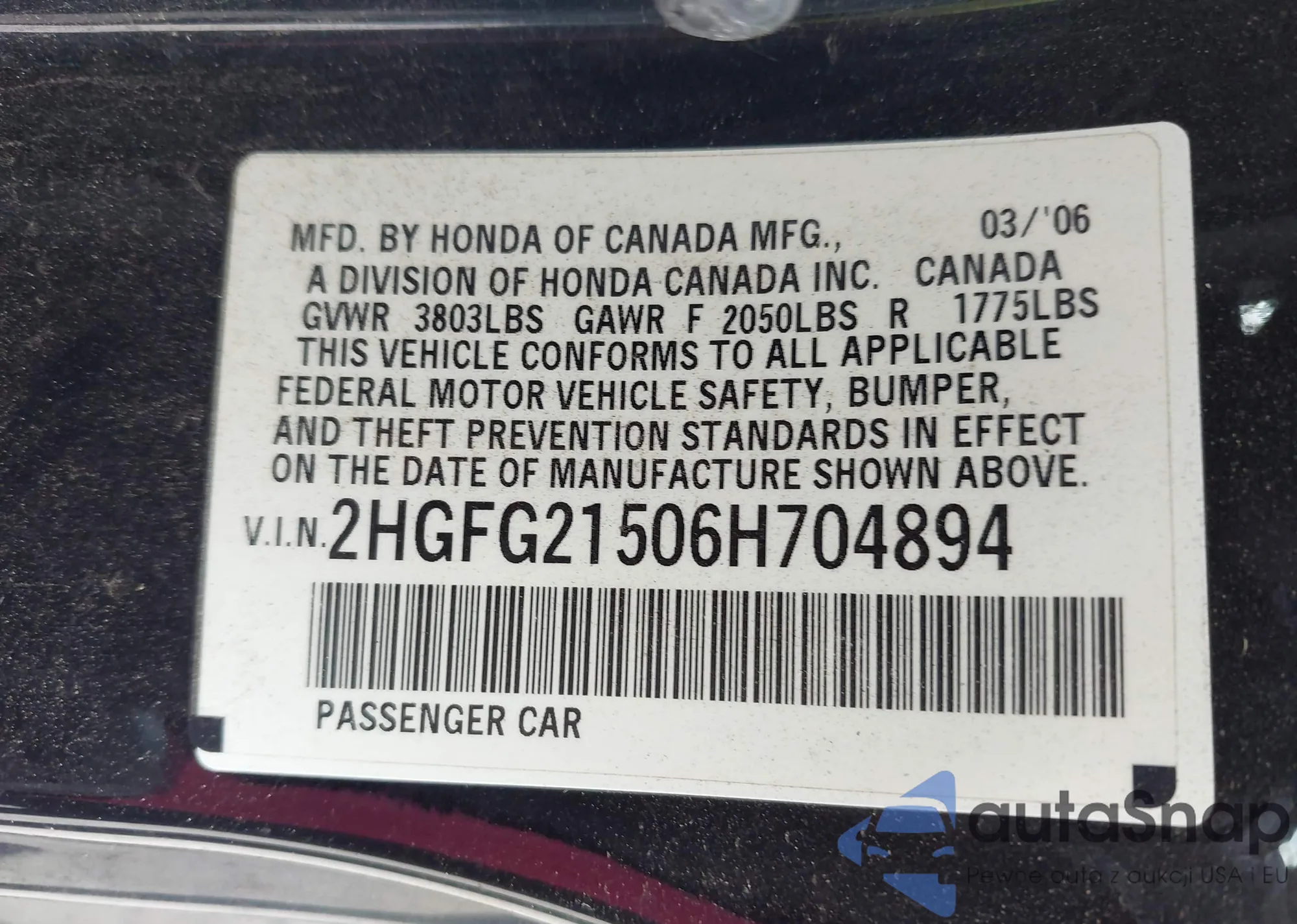 LOT: 43130716 VIN: 2HGFG21506H704894