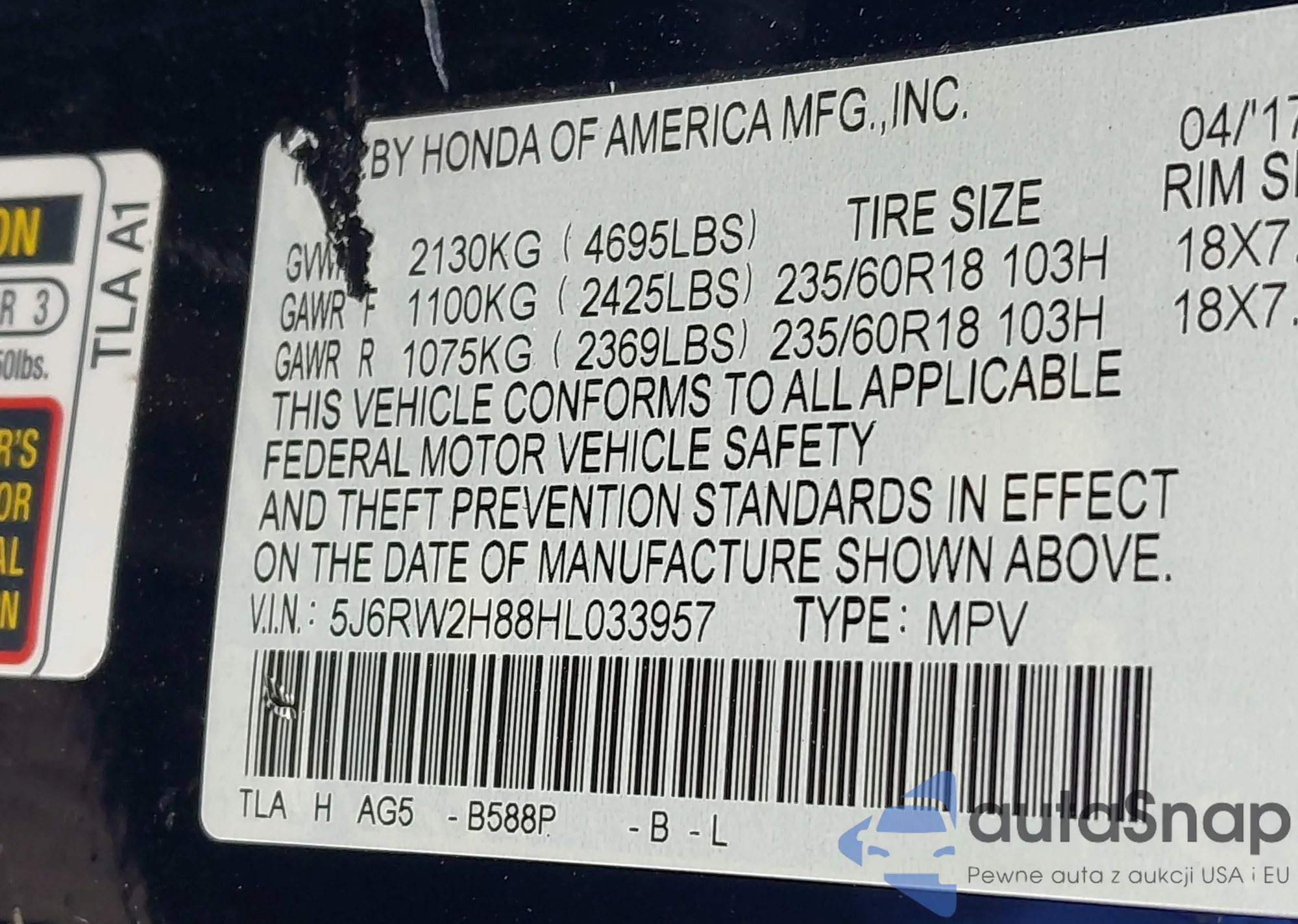 • VIN 5J6RW2H88HL033957
