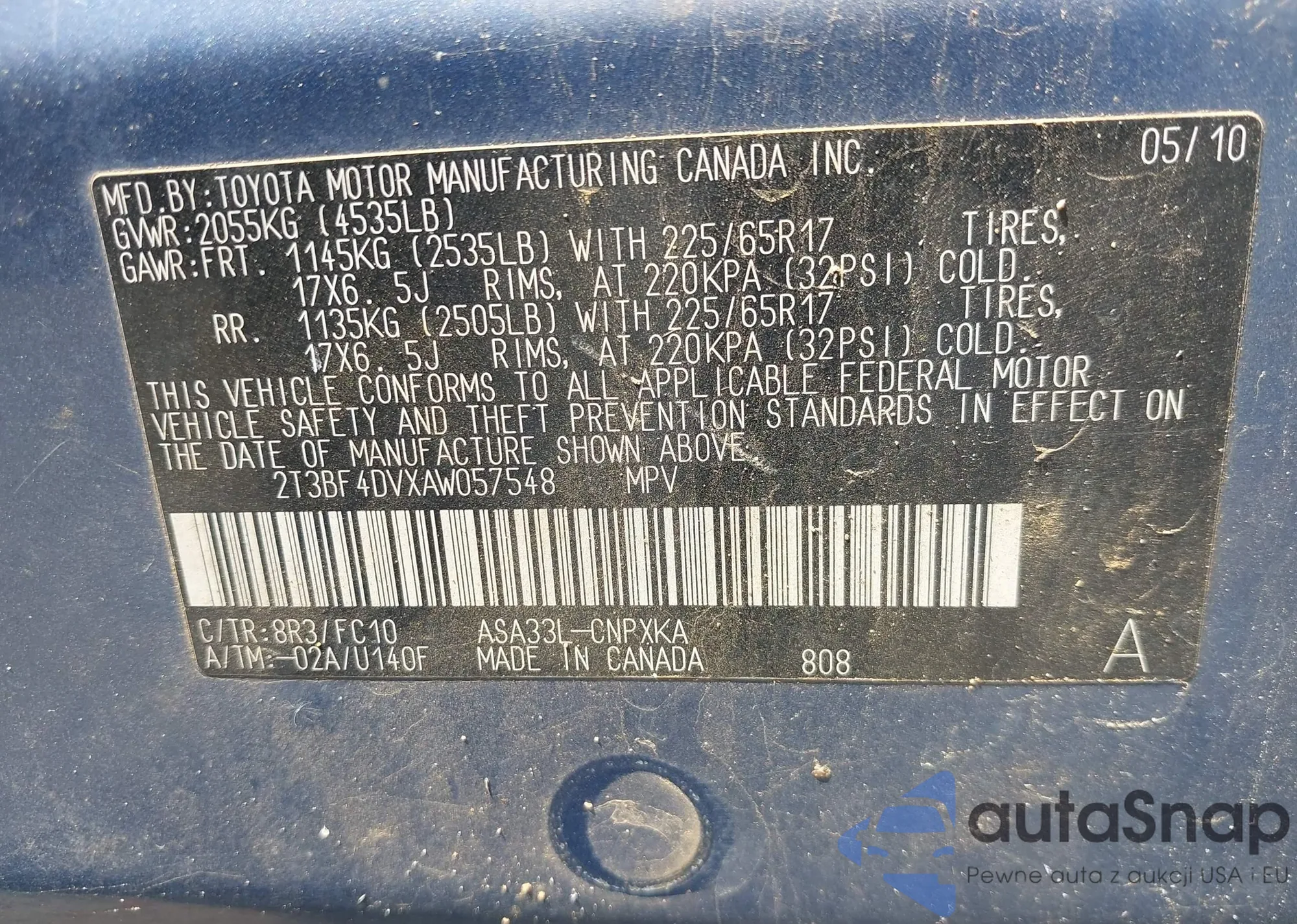 LOT: 43080991 VIN: 2T3BF4DVXAW057548