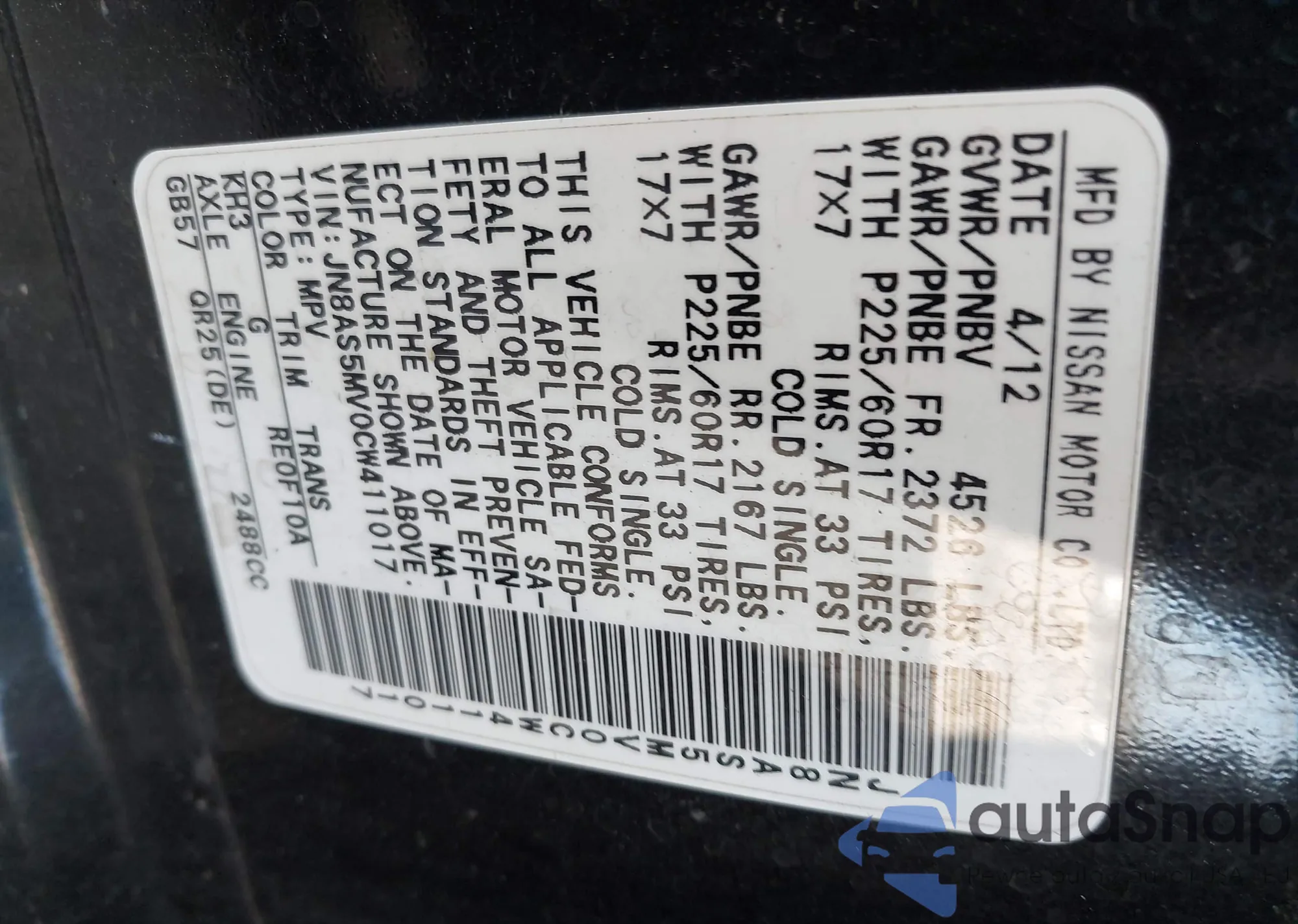 • VIN JN8AS5MV0CW411017
