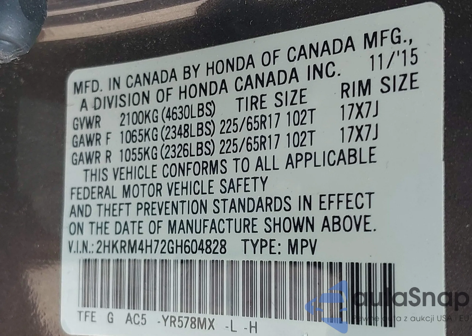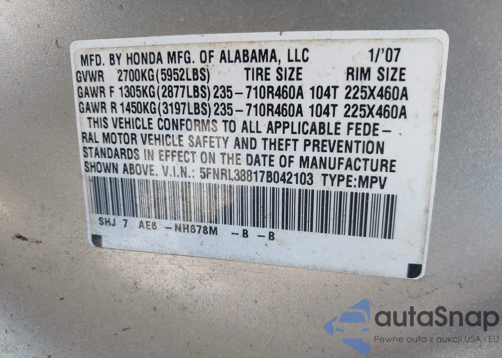 • VIN 5FNRL38817B042103