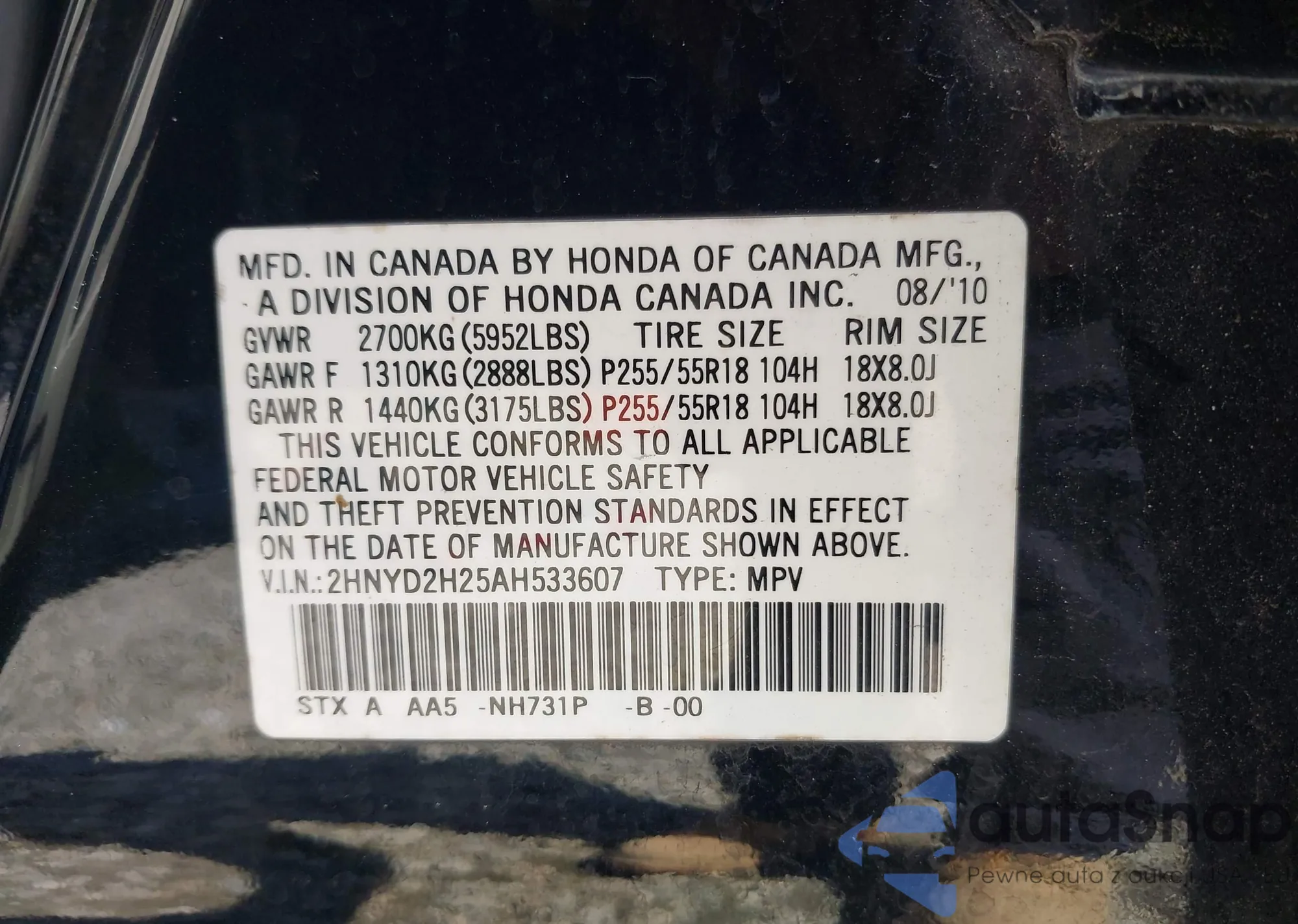 LOT: 42991947 VIN: 2HNYD2H25AH533607