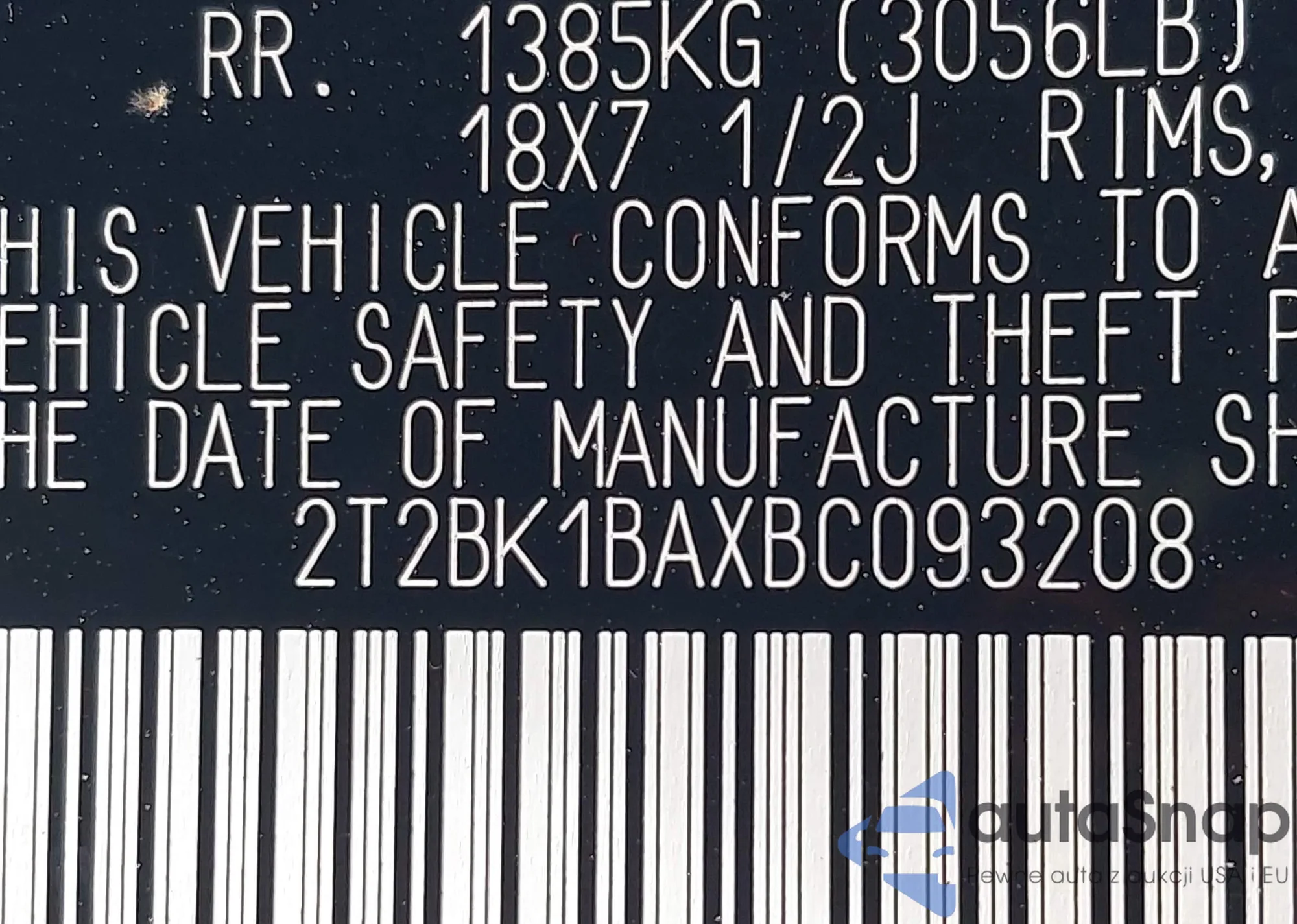 • VIN 2T2BK1BAXBC093208