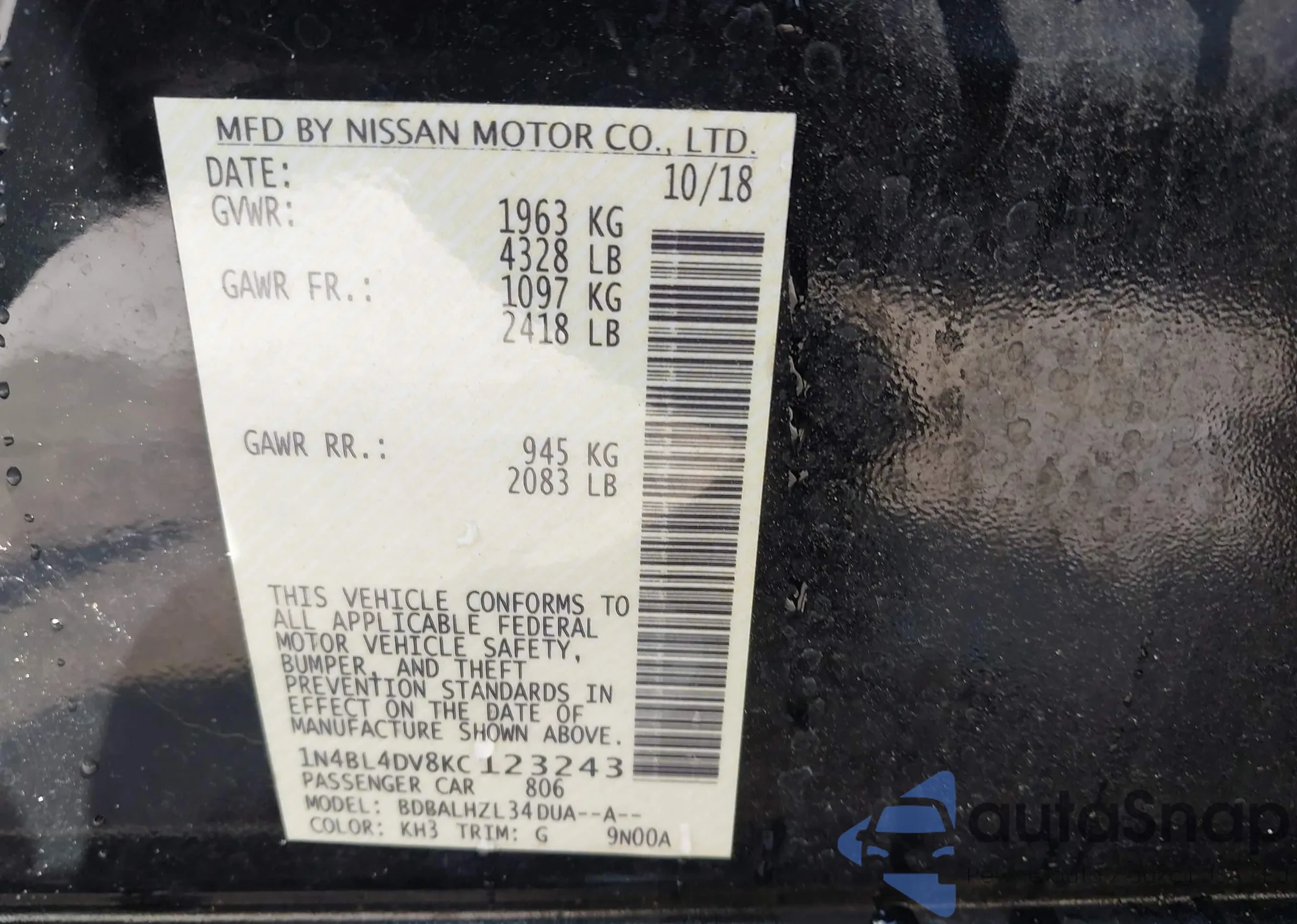 • VIN 1N4BL4DV8KC123243