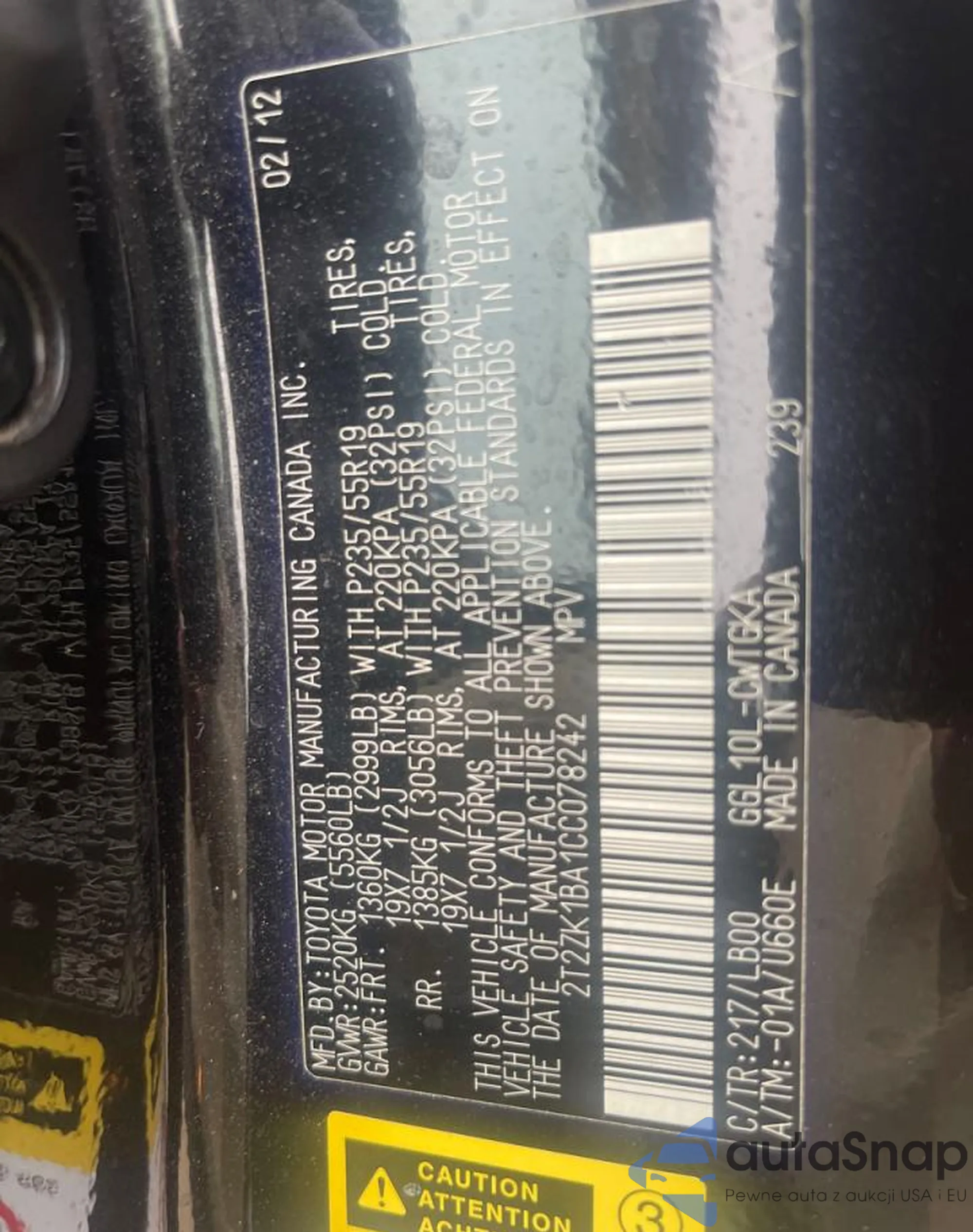 LOT: 70774805 VIN: 2T2ZK1BA1CC078242