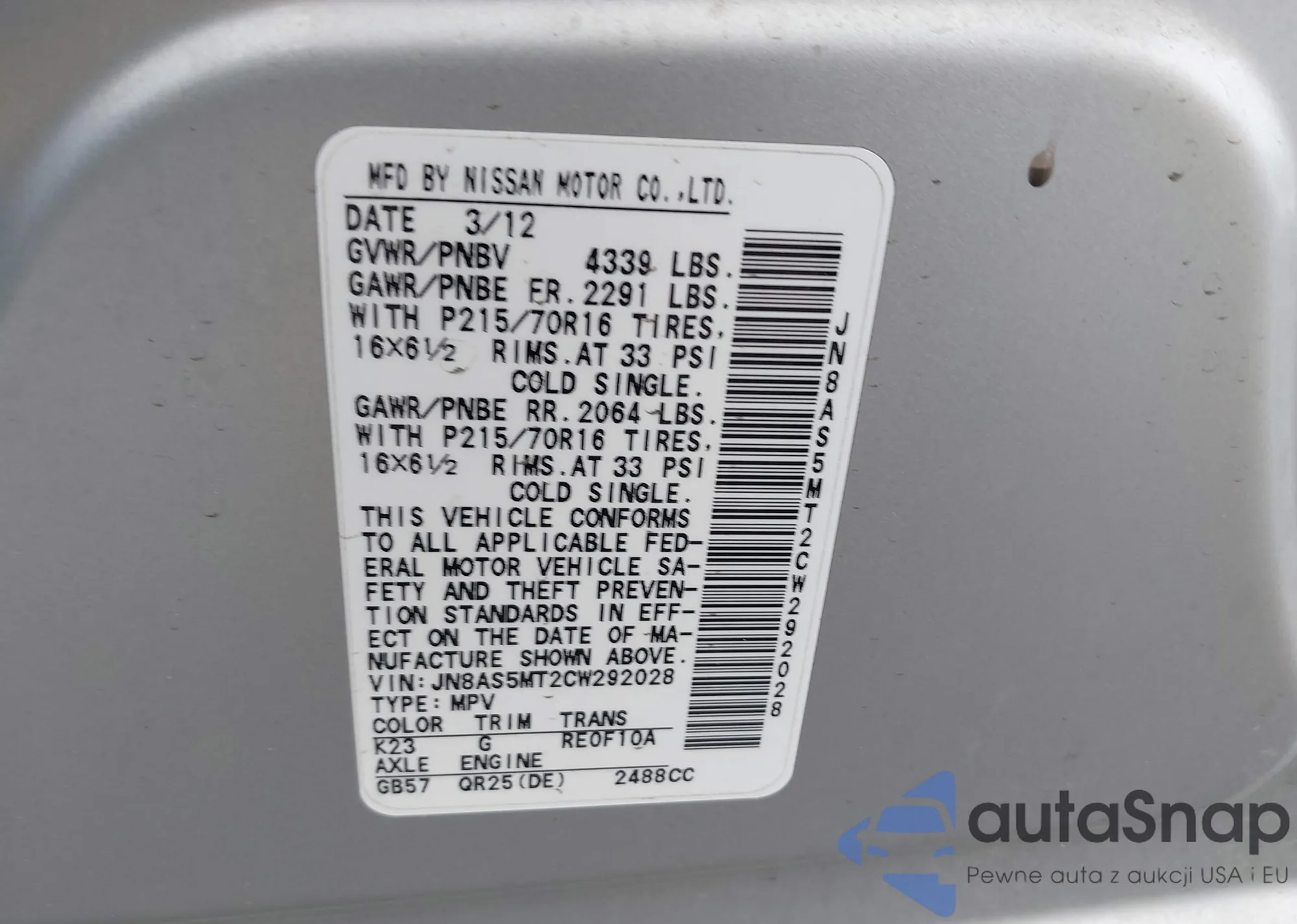 LOT: 43094637 VIN: JN8AS5MT2CW292028