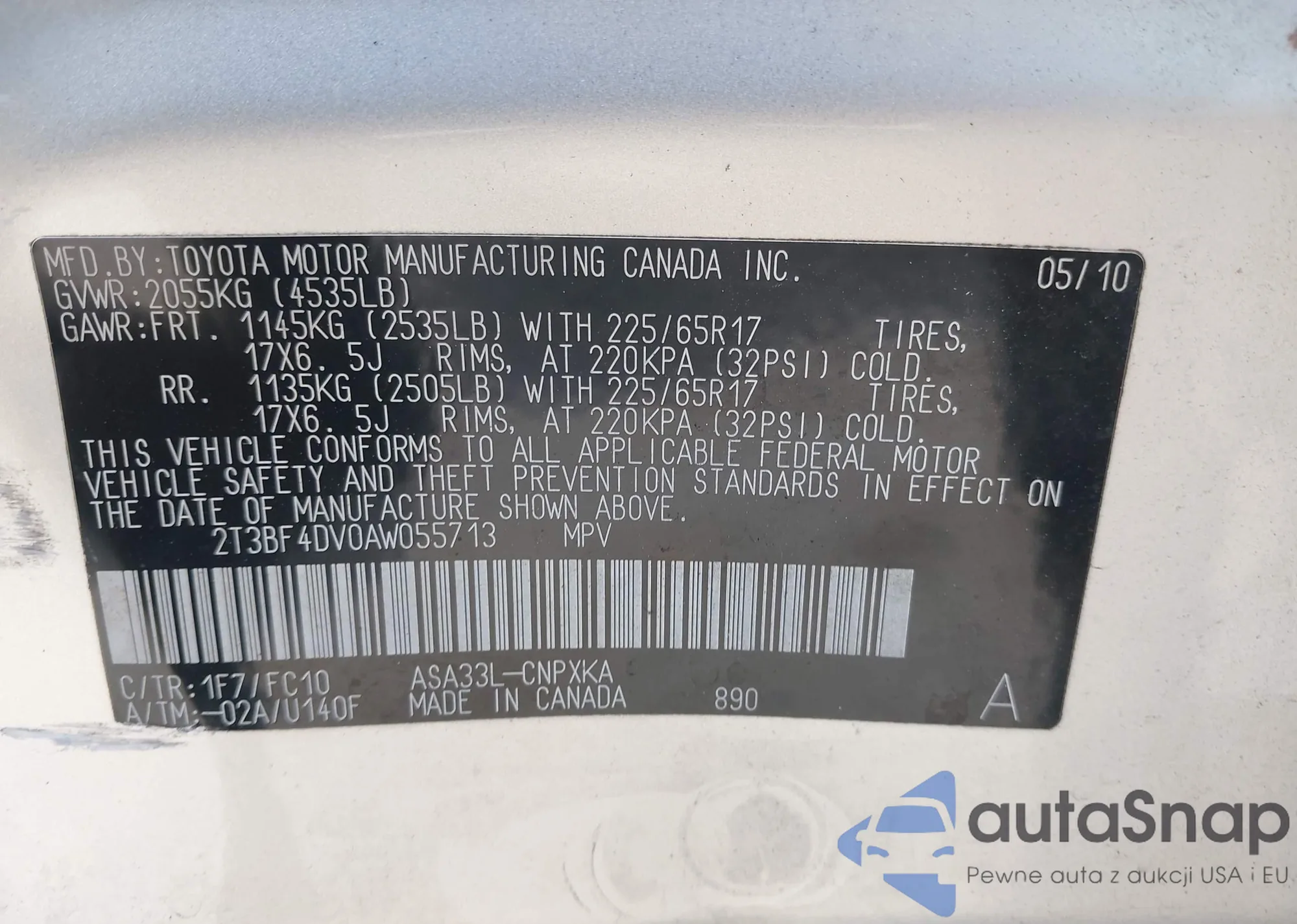 • VIN 2T3BF4DV0AW055713