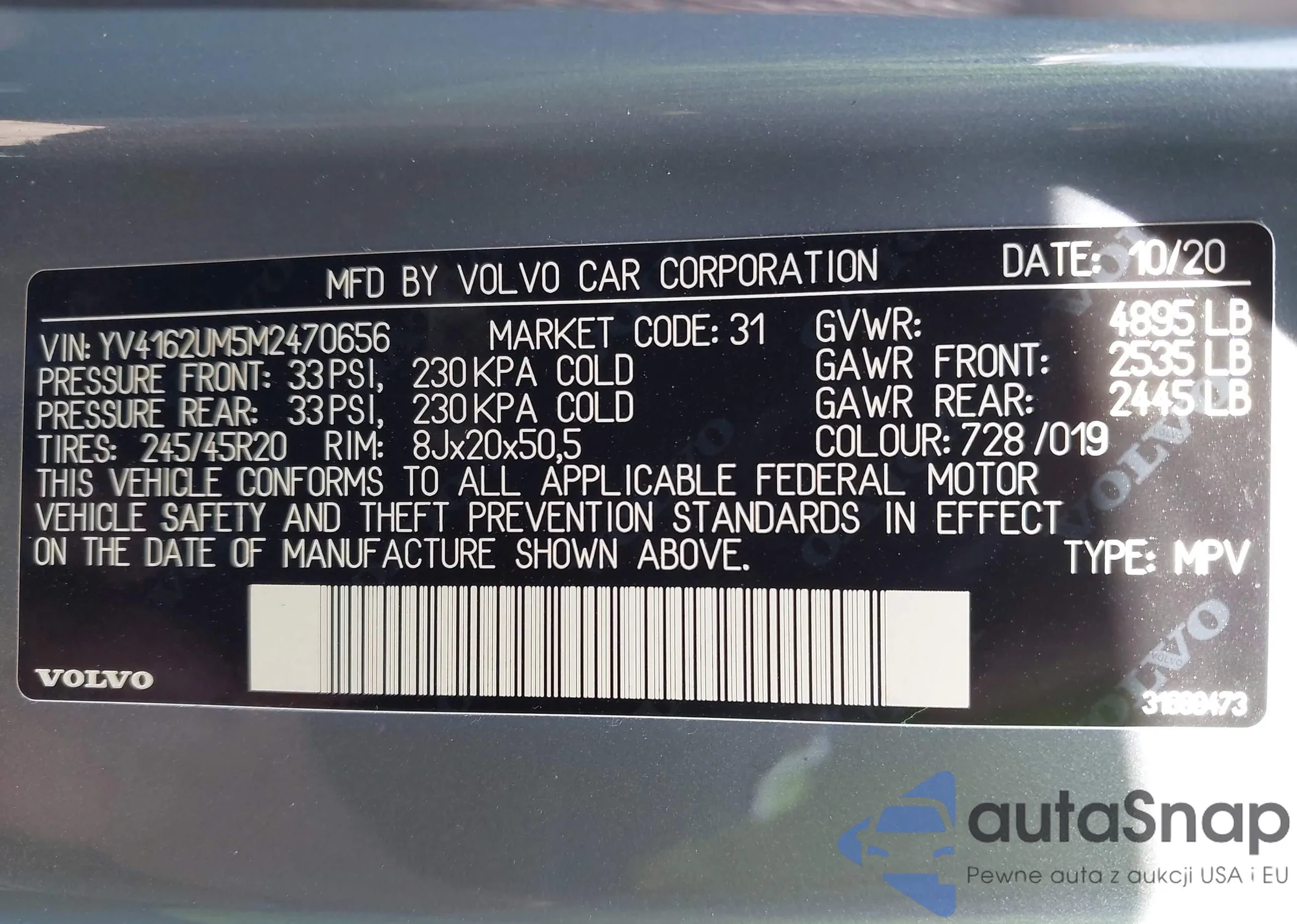 LOT: 43054525 VIN: YV4162UM5M2470656
