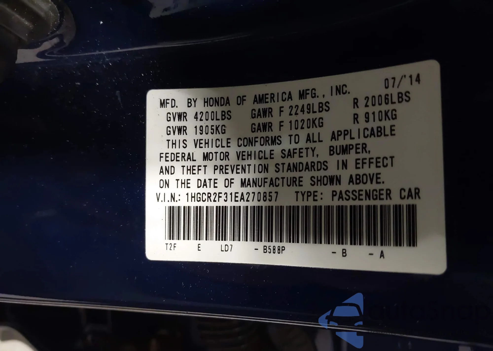 LOT: 43168935 VIN: 1HGCR2F31EA270857