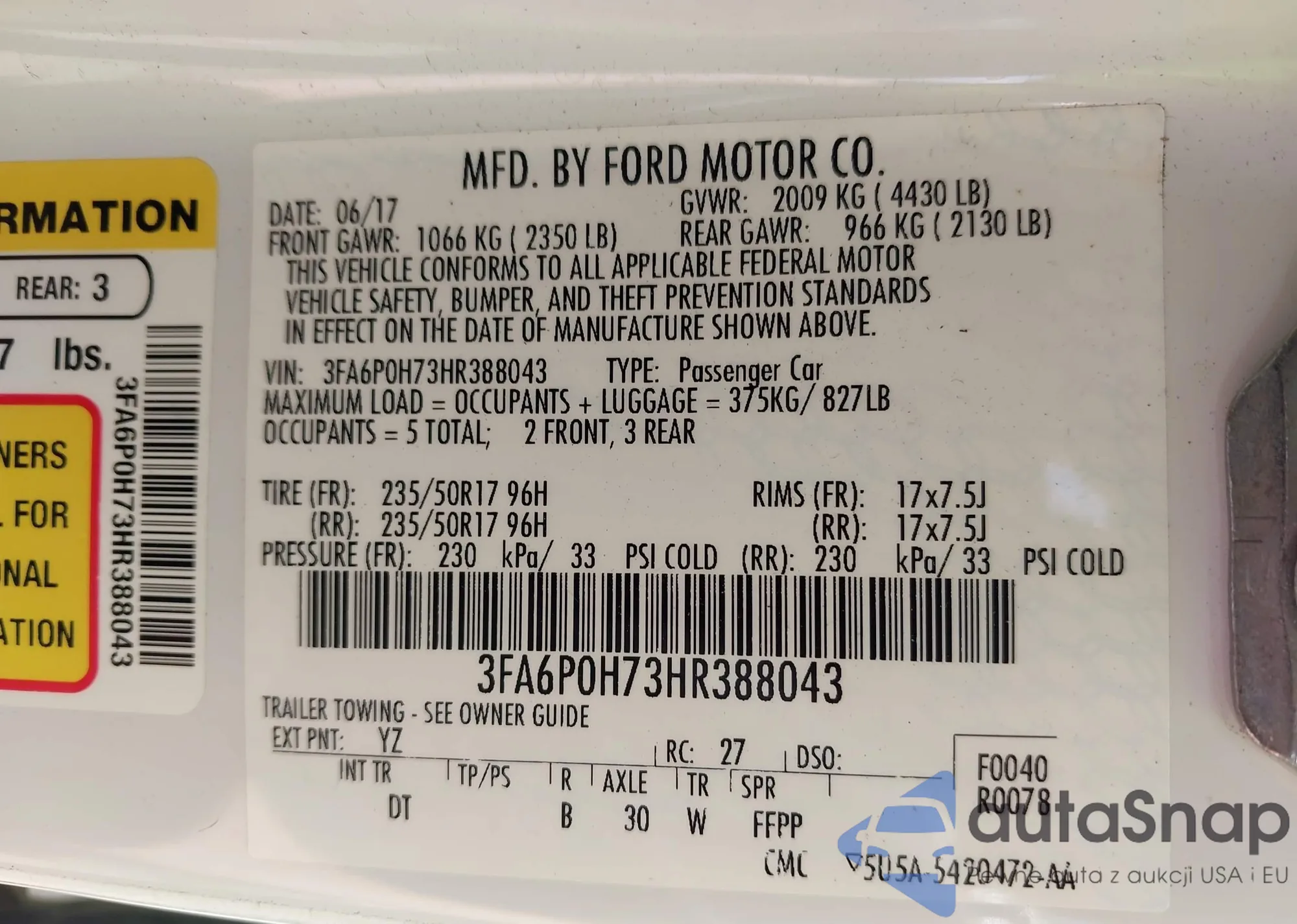 LOT: 42744980 VIN: 3FA6P0H73HR388043