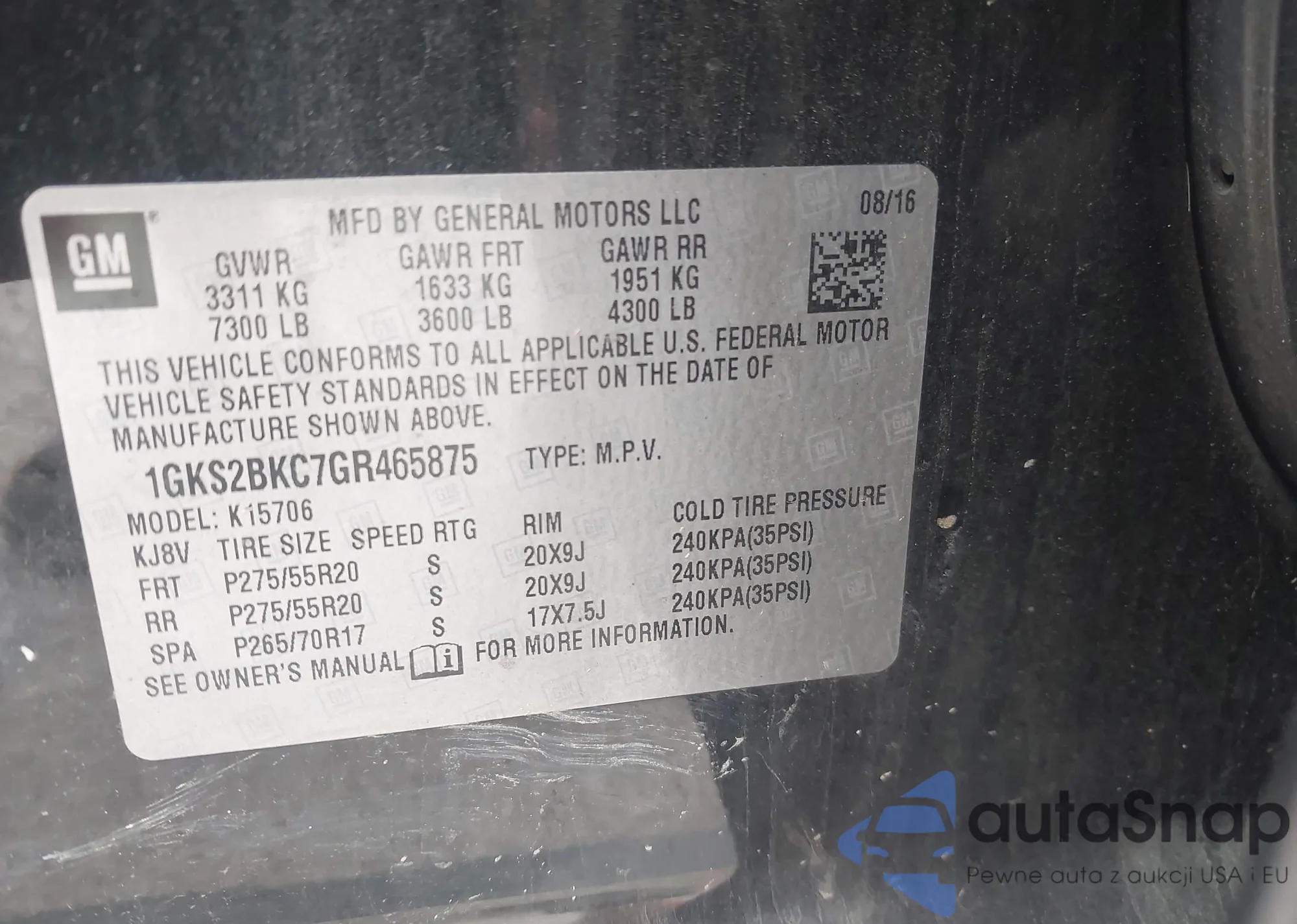 LOT: 42756743 VIN: 1GKS2BKC7GR465875