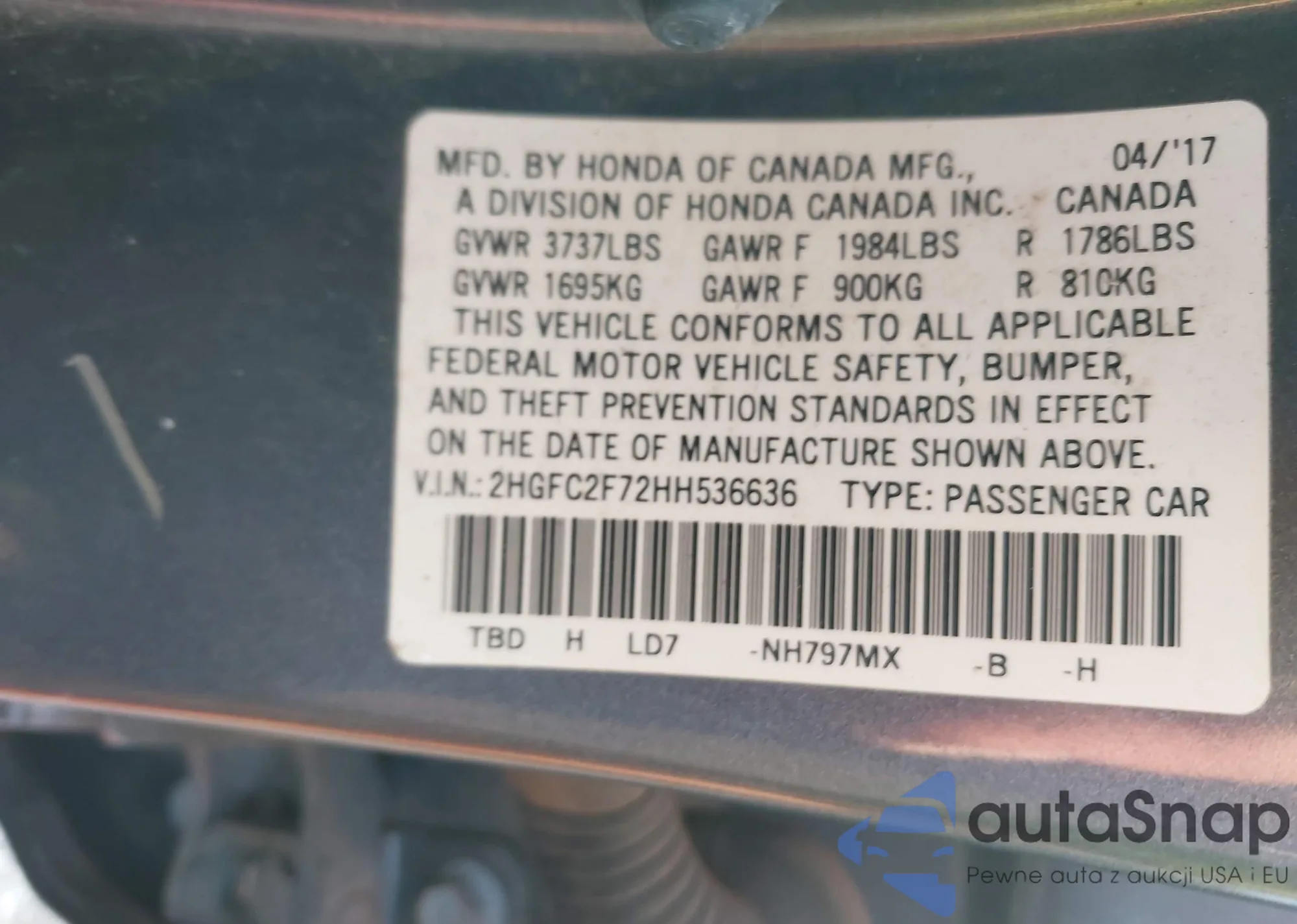 LOT: 43127979 VIN: 2HGFC2F72HH536636