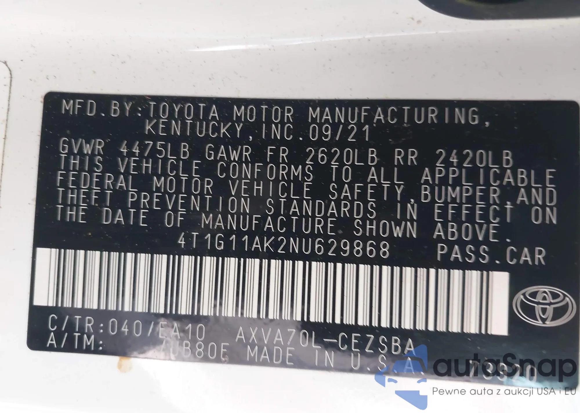 • VIN 4T1G11AK2NU629868