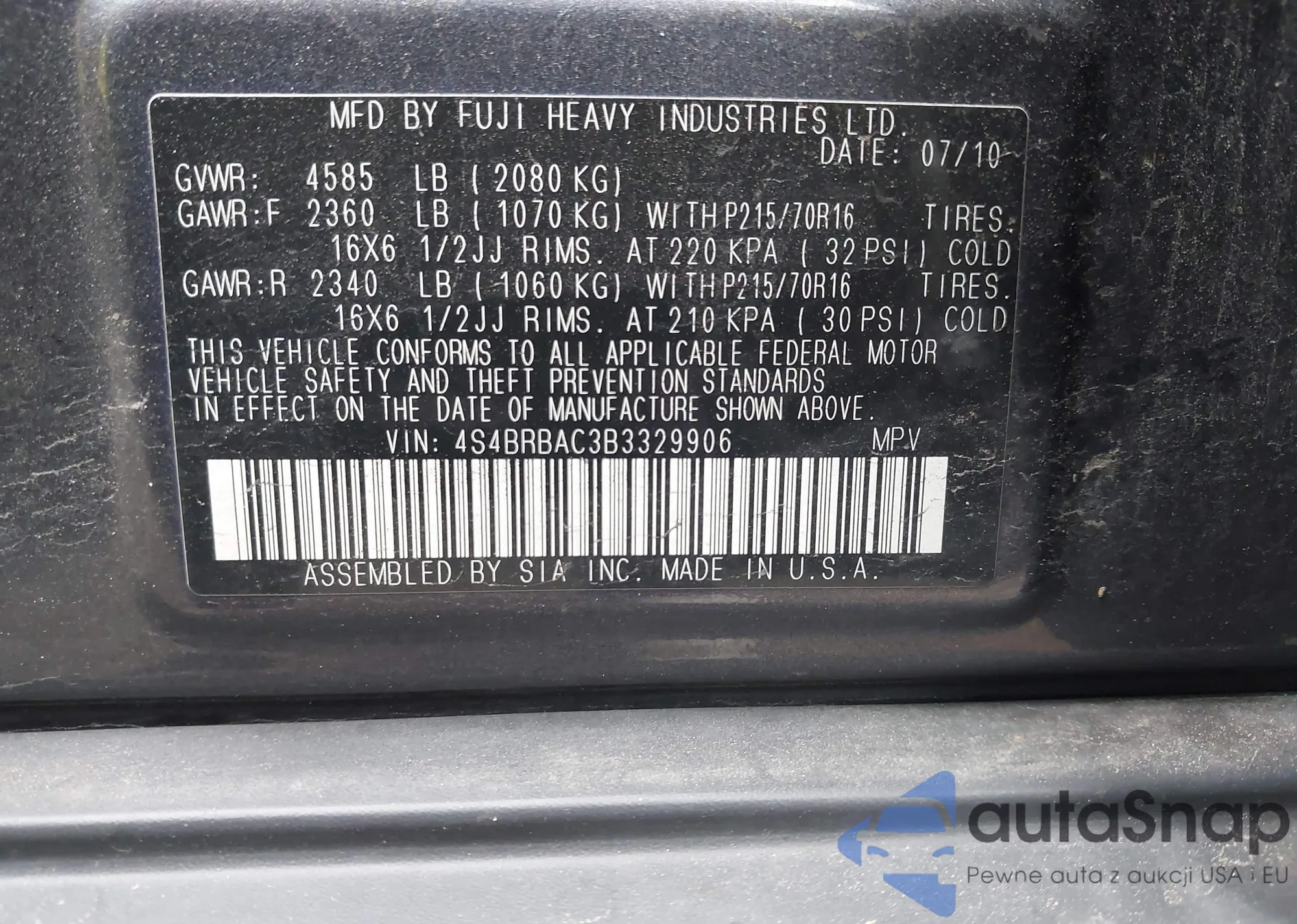 • VIN 4S4BRBAC3B3329906