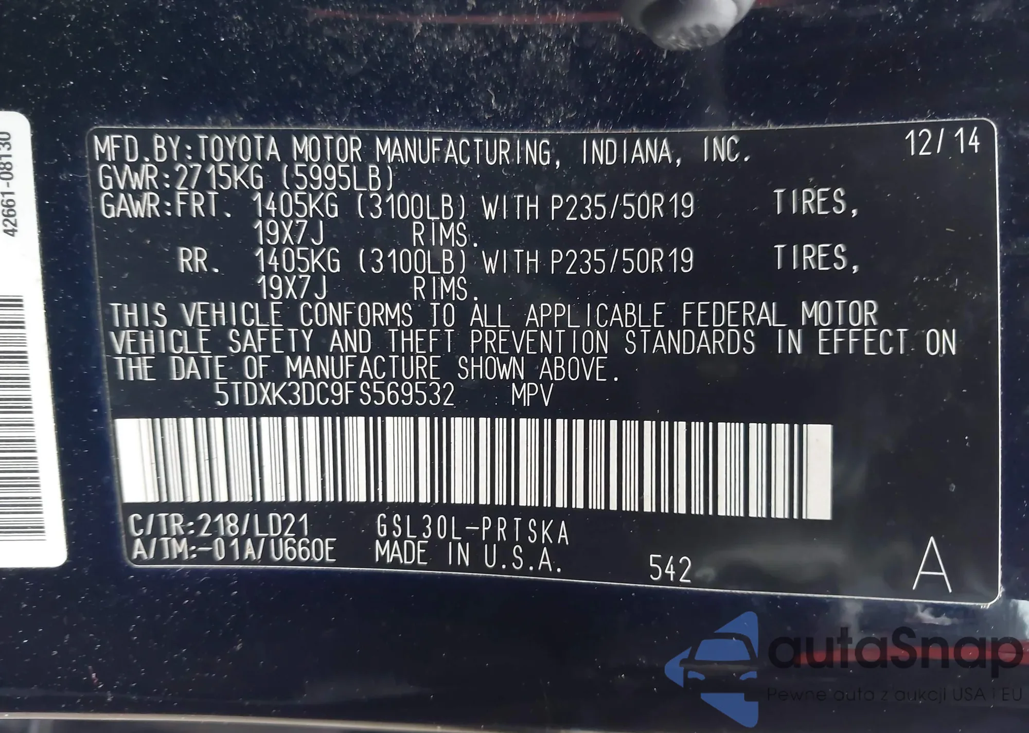 LOT: 42992436 VIN: 5TDXK3DC9FS569532