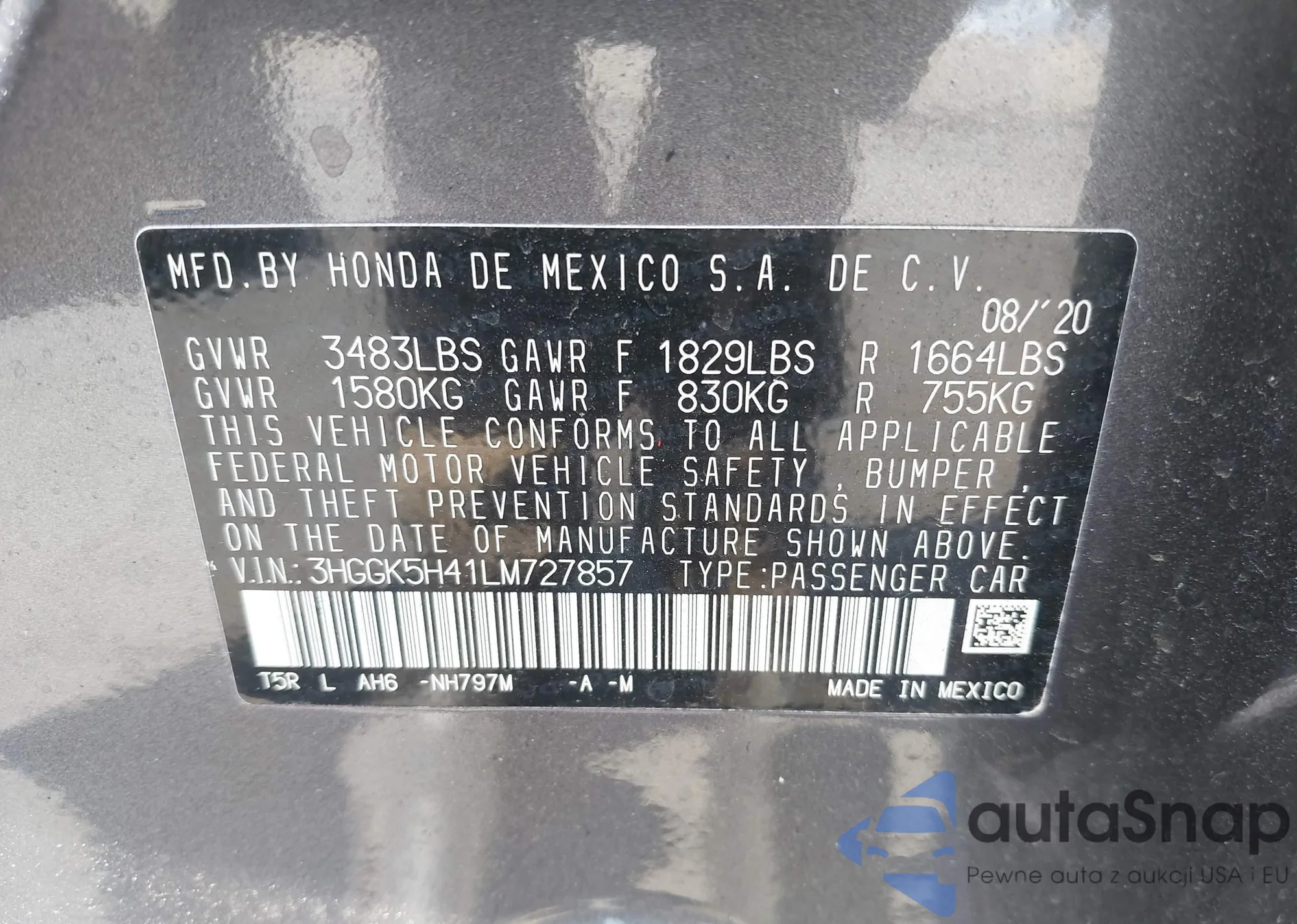 LOT: 42804342 VIN: 3HGGK5H41LM727857