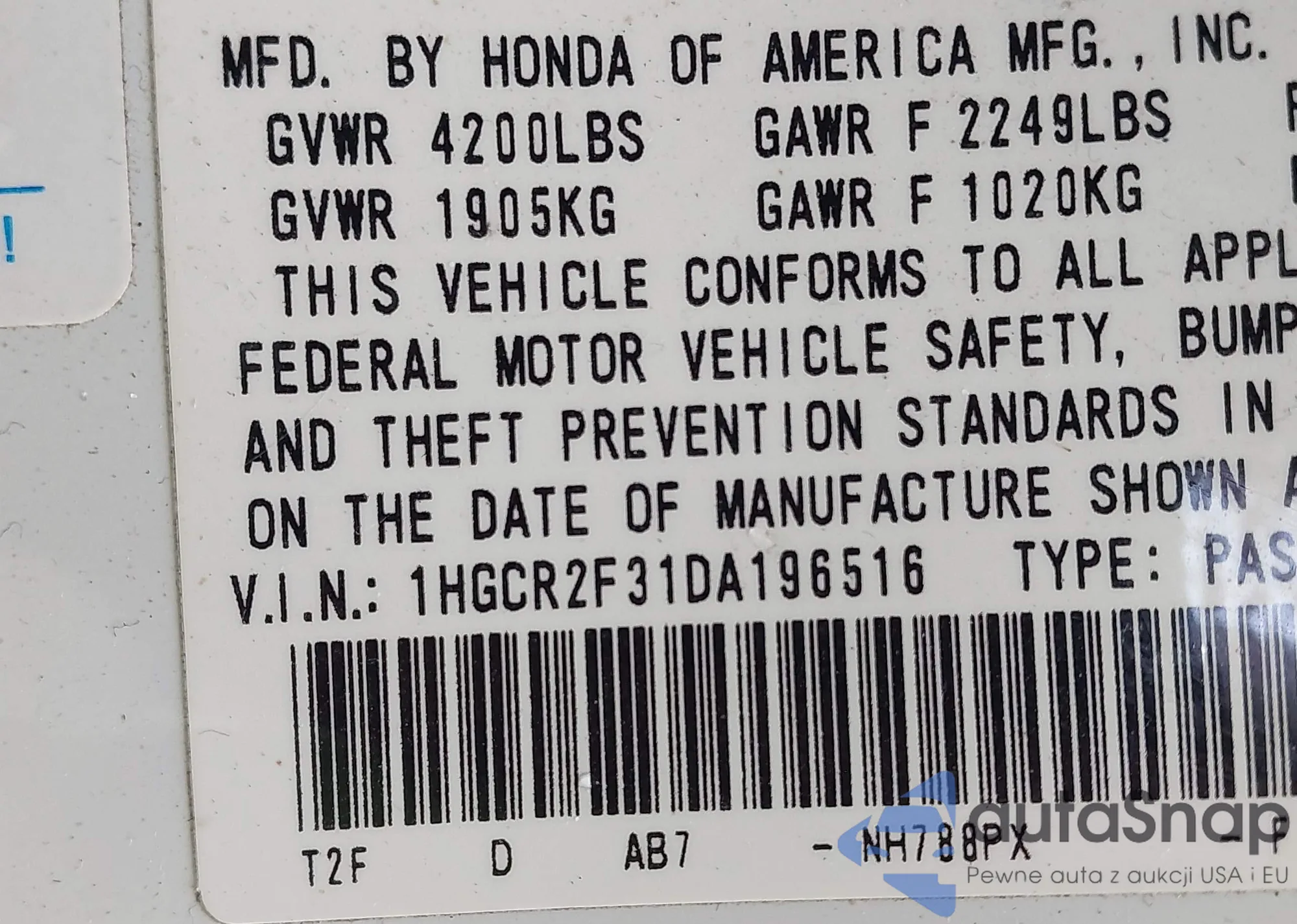 LOT: 42888310 VIN: 1HGCR2F31DA196516