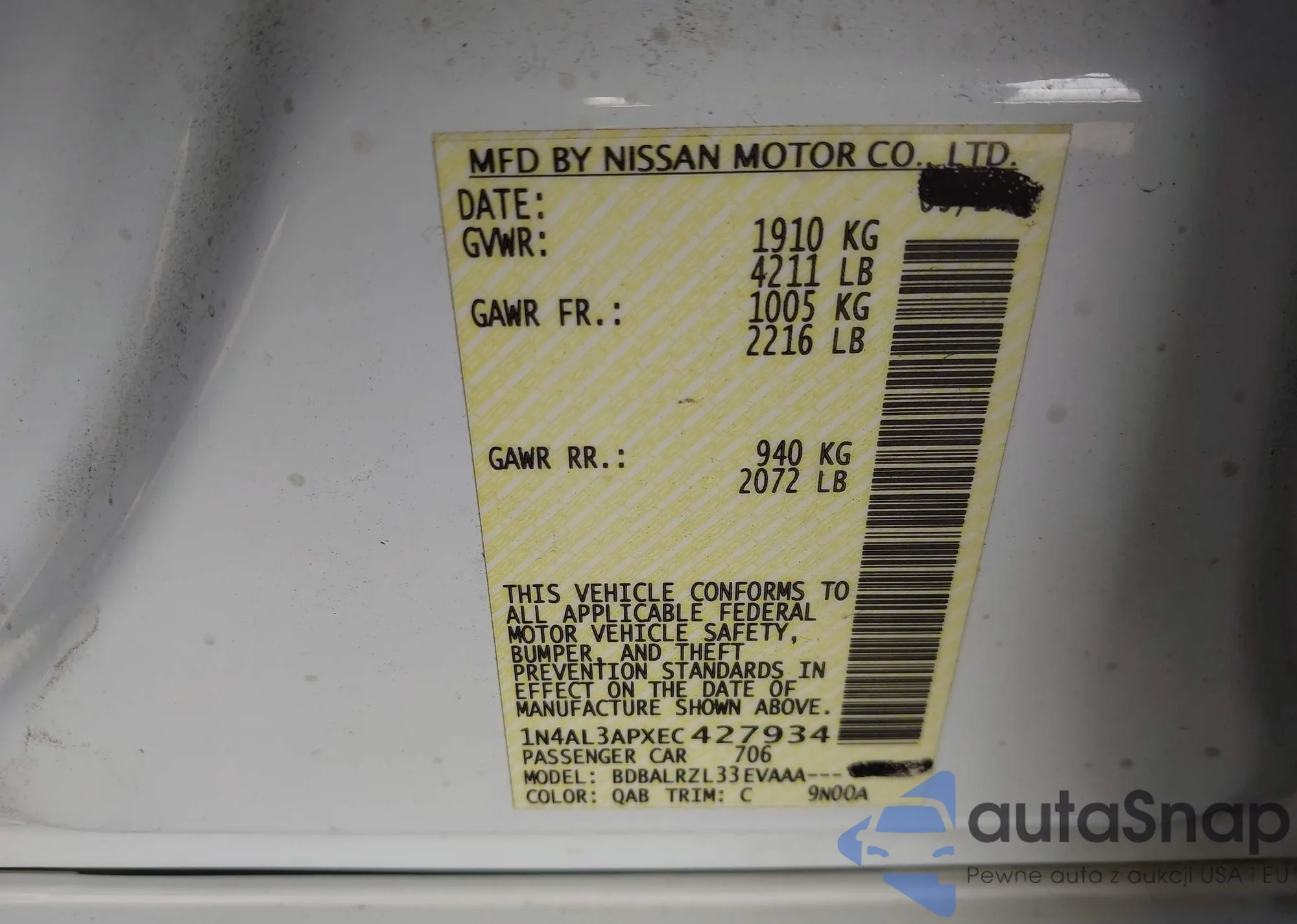 LOT: 43016974 VIN: 1N4AL3APXEC427934