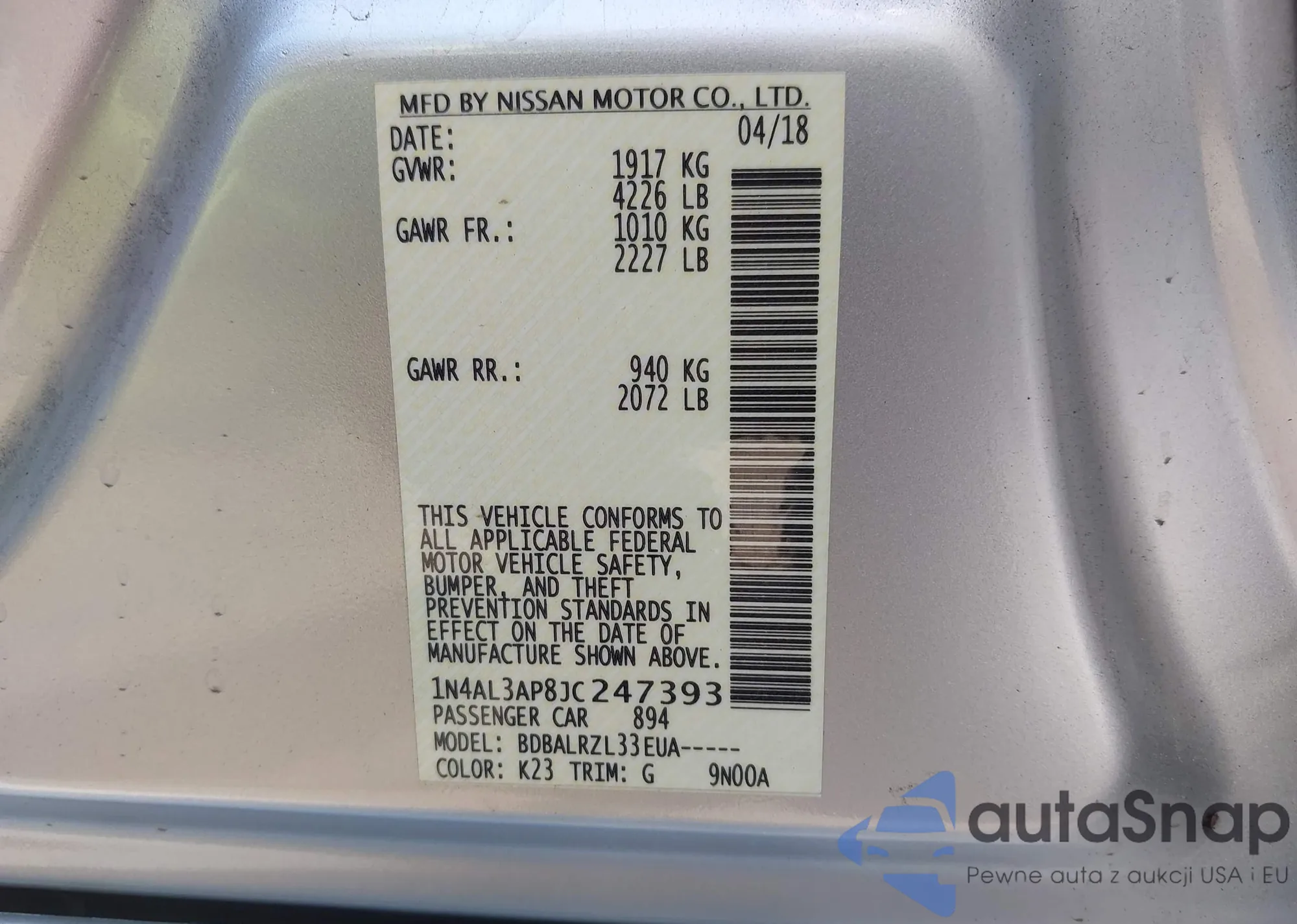 LOT: 42910554 VIN: 1N4AL3AP8JC247393