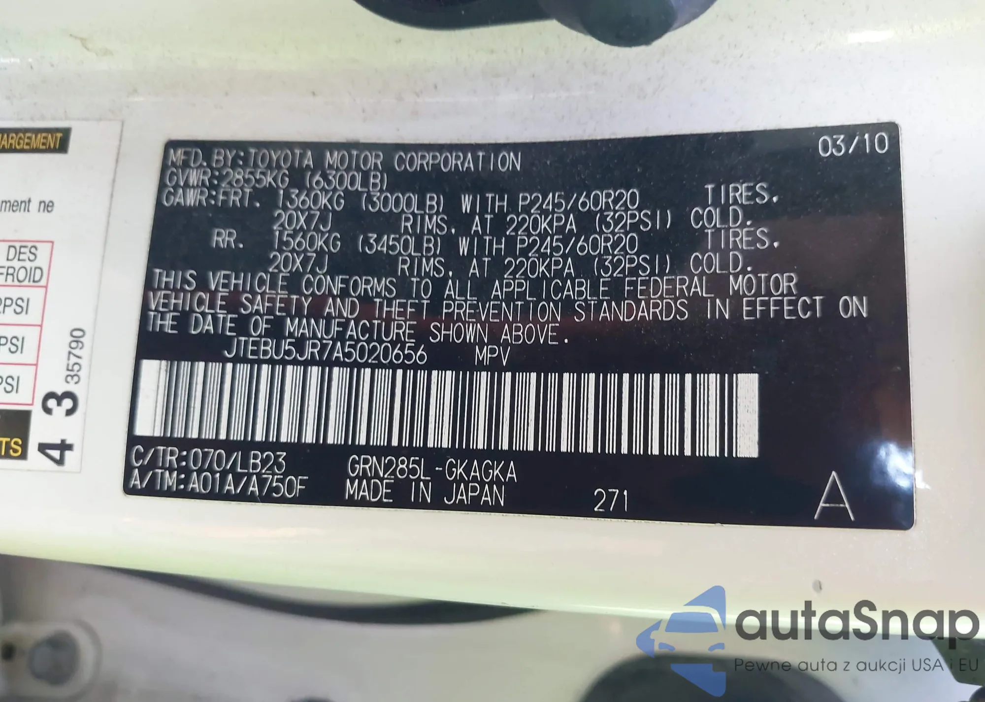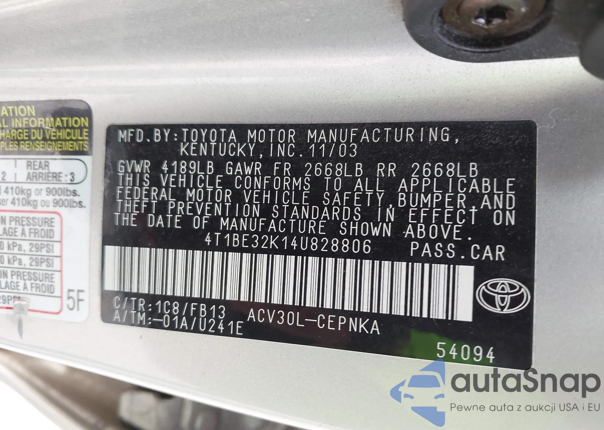 LOT: 43152005 VIN: 4T4BF1FK1DR308350
