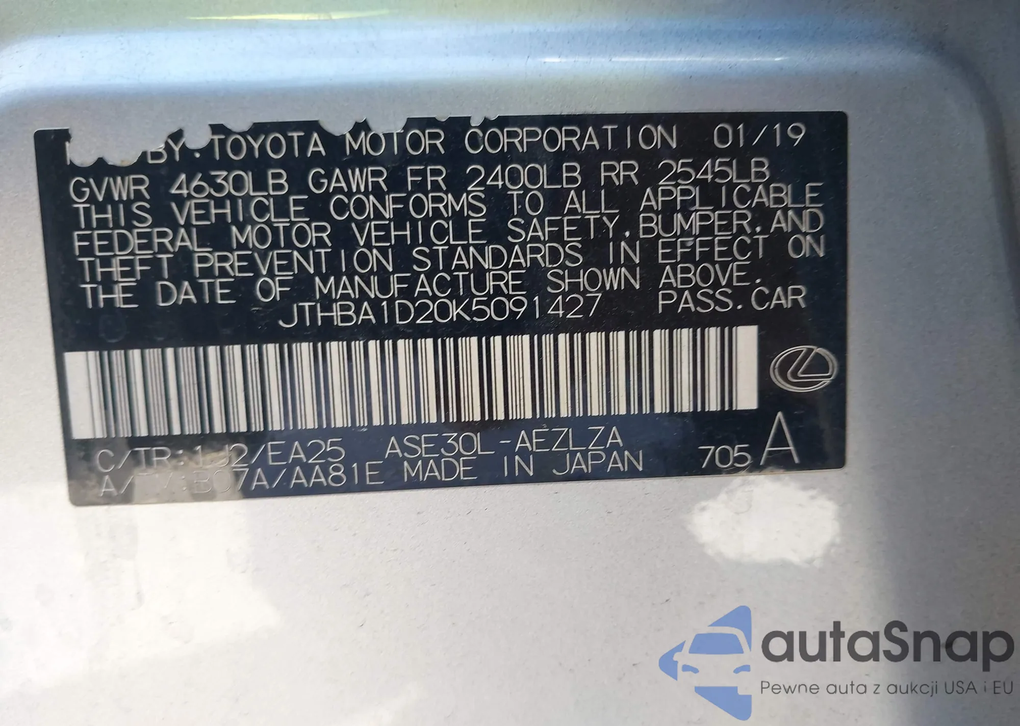 LOT: 43000547 VIN: JTHBA1D20K5091427