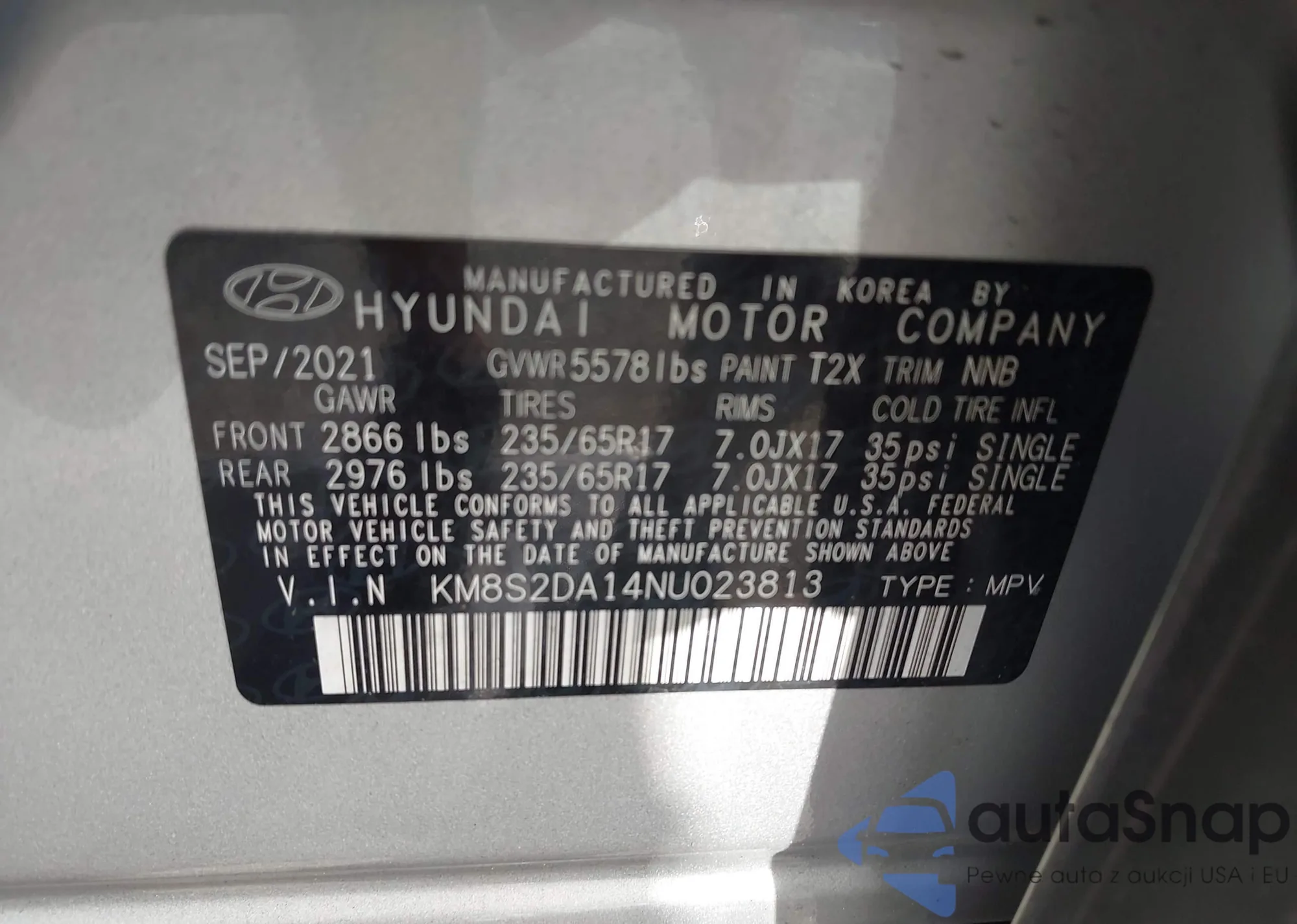 LOT: 42917349 VIN: KM8S2DA14NU023813
