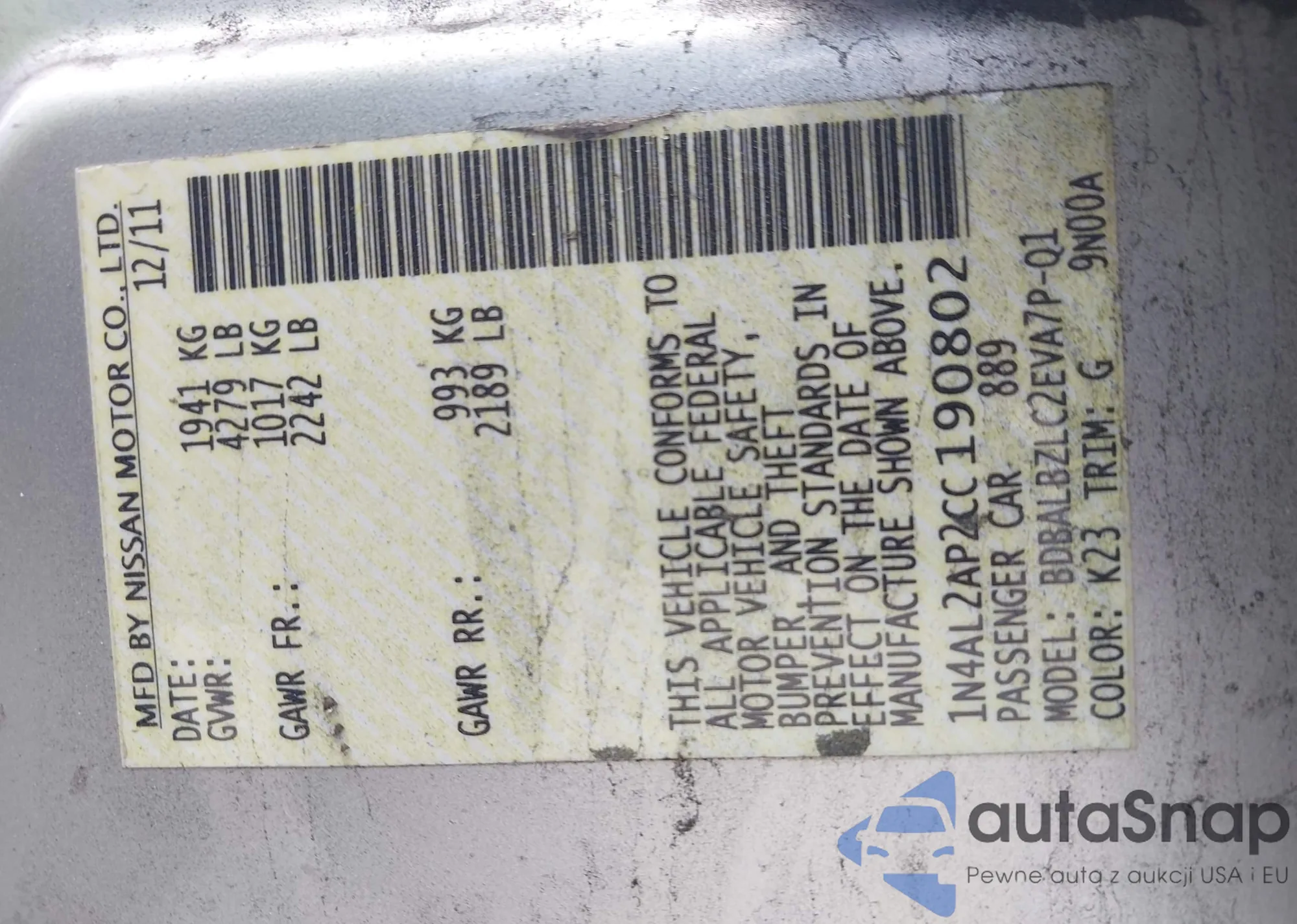 LOT: 42862454 VIN: 1N4AL2AP2CC190802