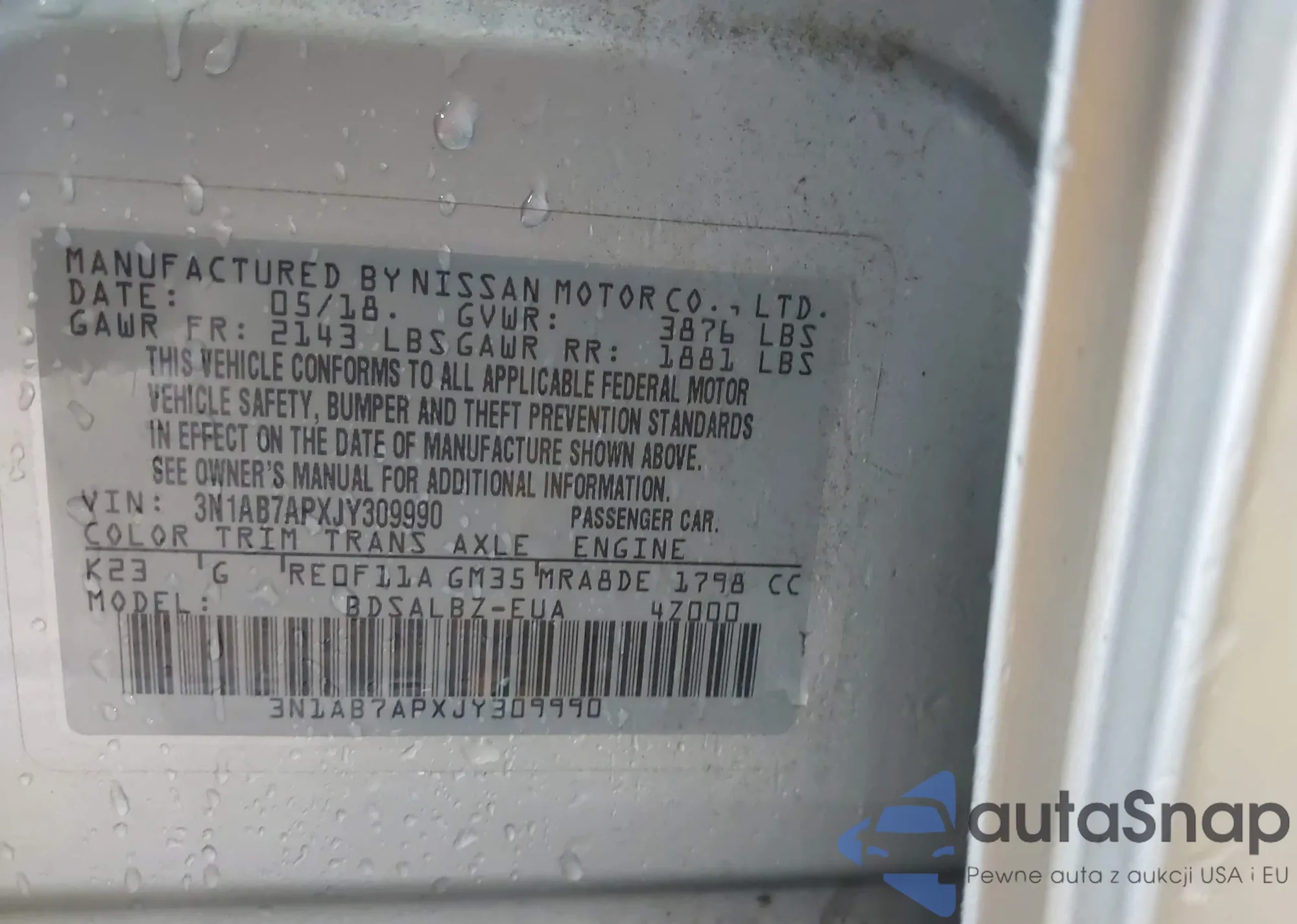 LOT: 42901074 VIN: 3N1AB7APXJY309990
