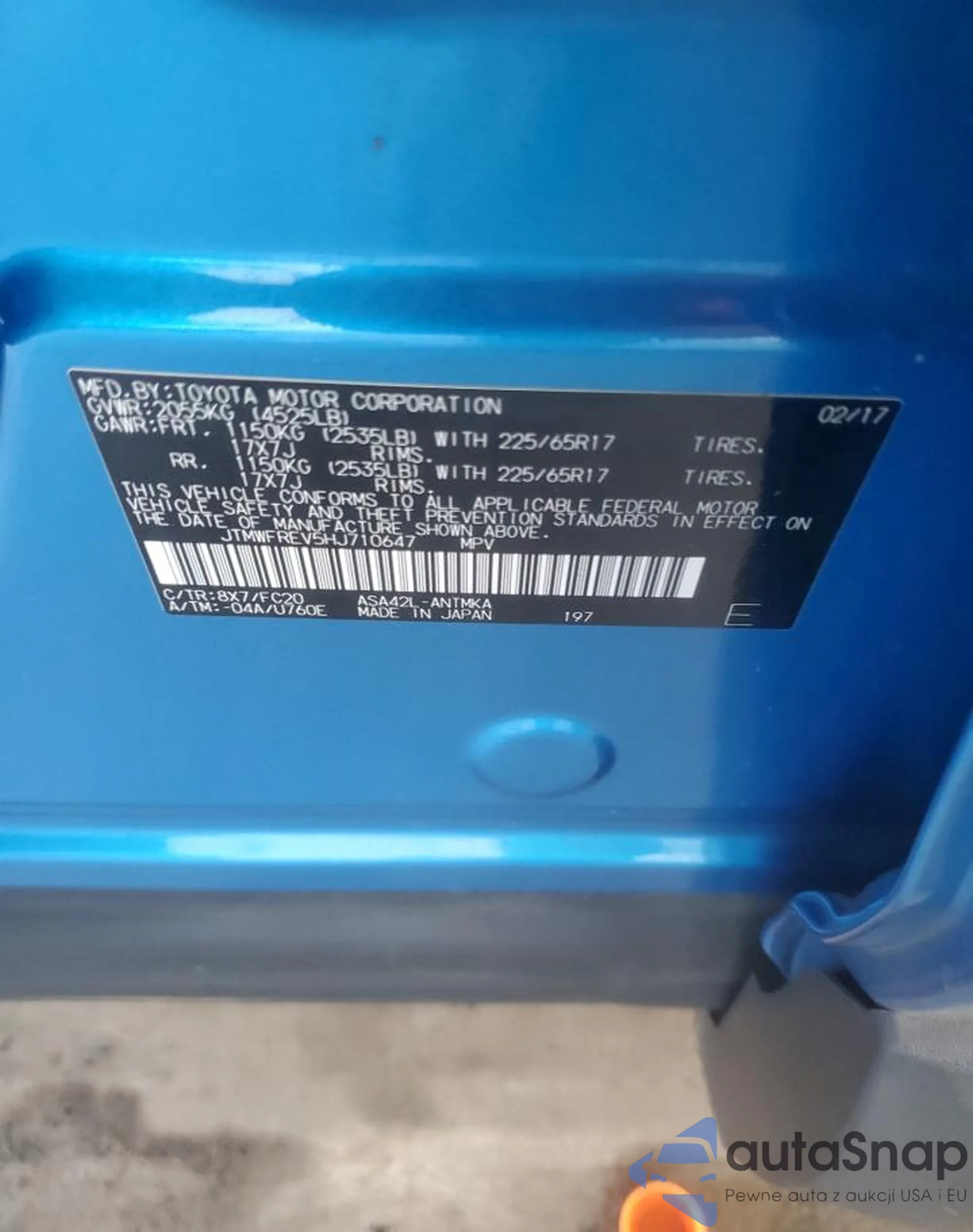 LOT: 70518165 VIN: JTMWFREV5HJ710647