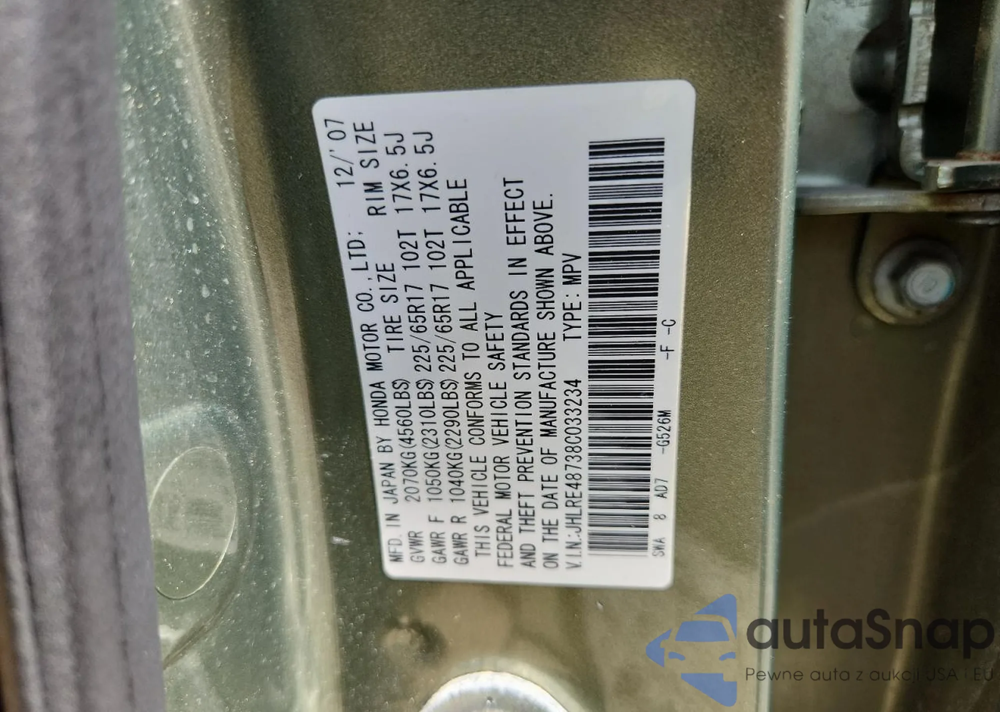 LOT: 65210195 VIN: JHLRE48738C033234