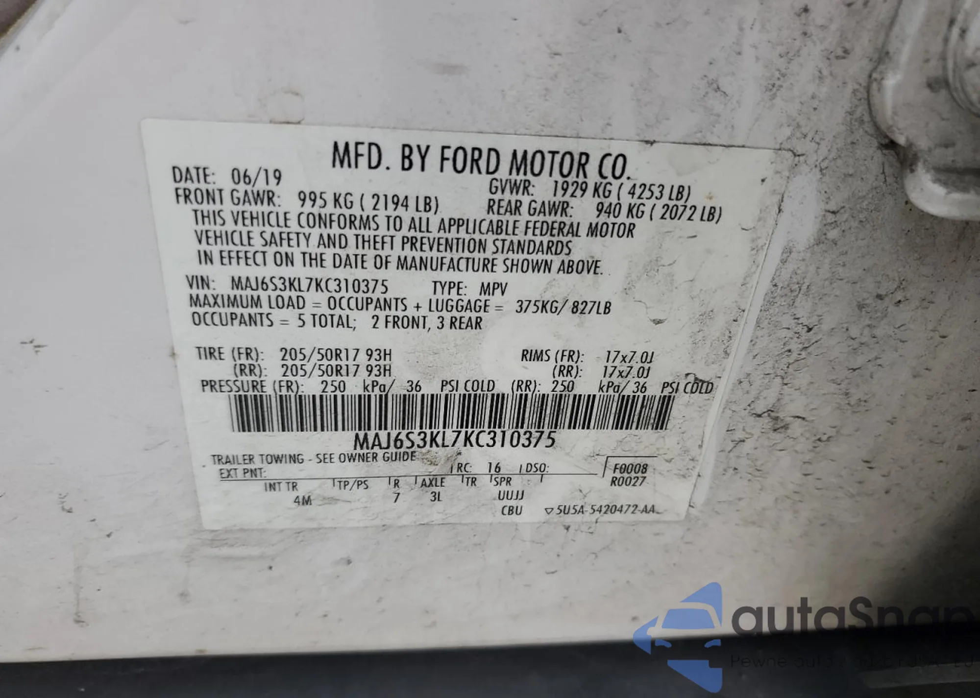 • VIN MAJ6S3KL7KC310375