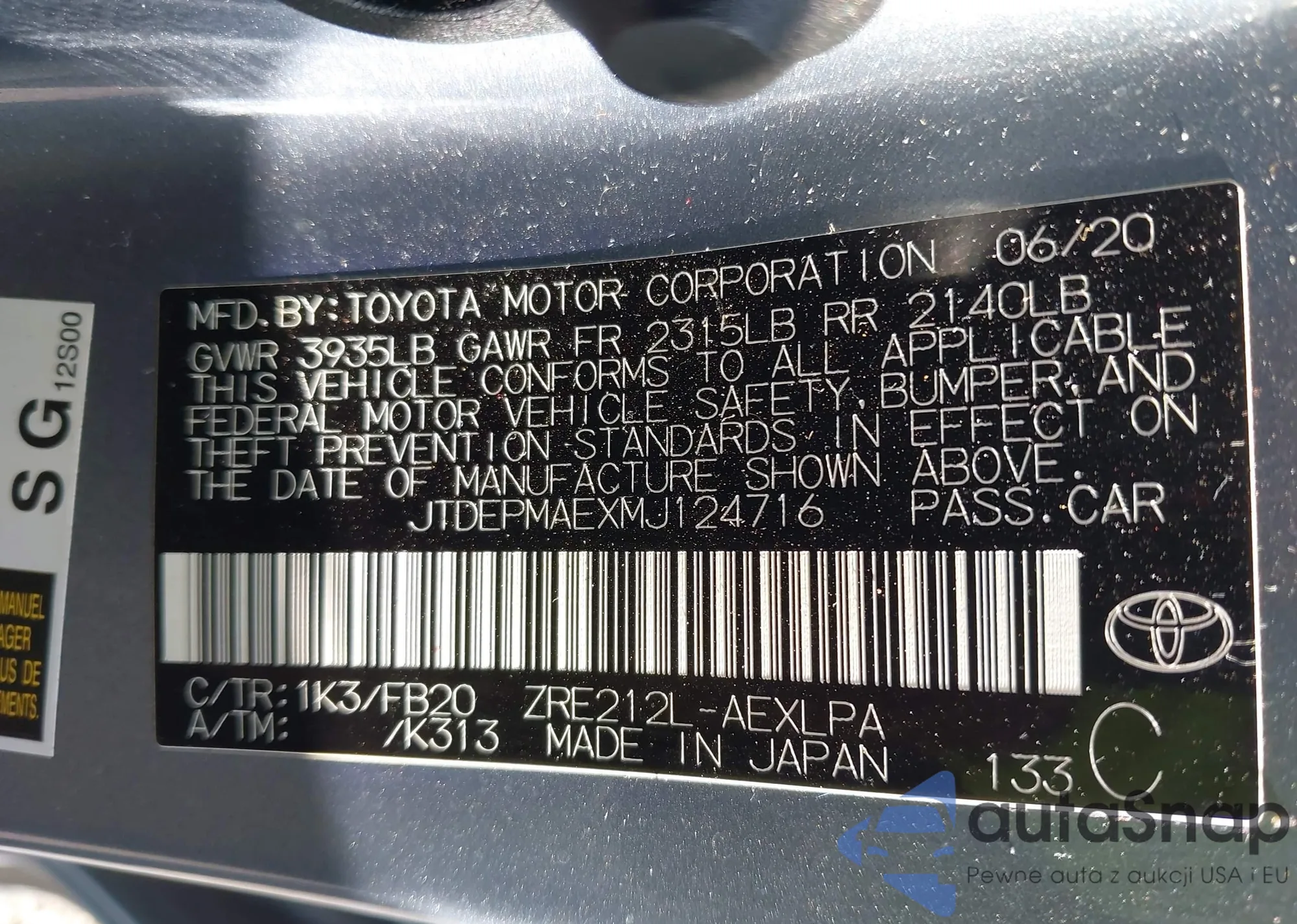 LOT: 42993445 VIN: JTDEPMAEXMJ124716