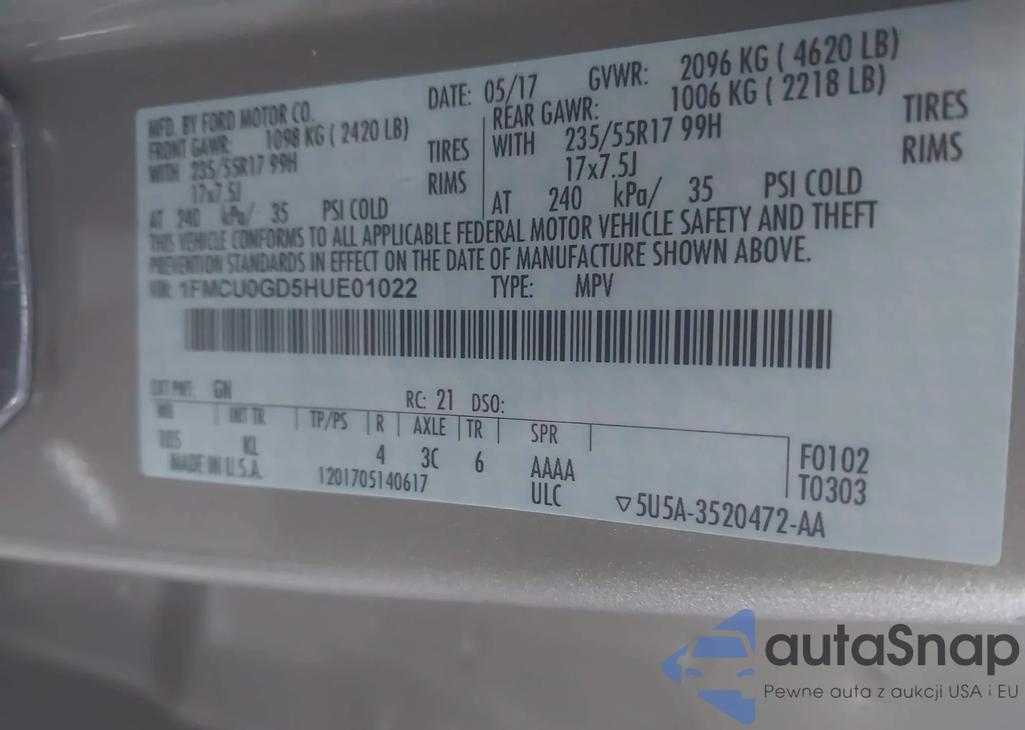 • VIN 1FMCU0GD5HUE01022