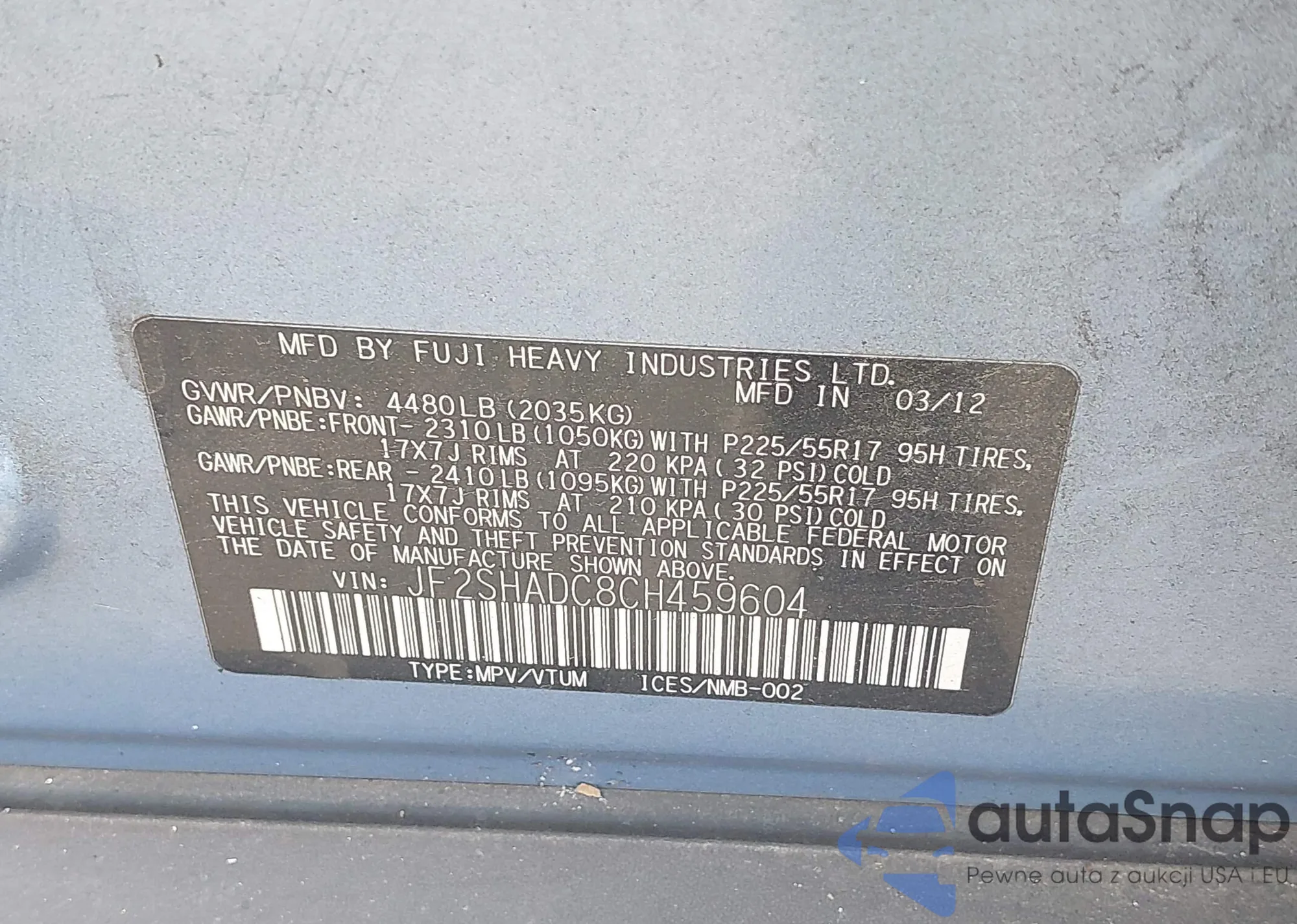 LOT: 42844014 VIN: JF2SHADC8CH459604