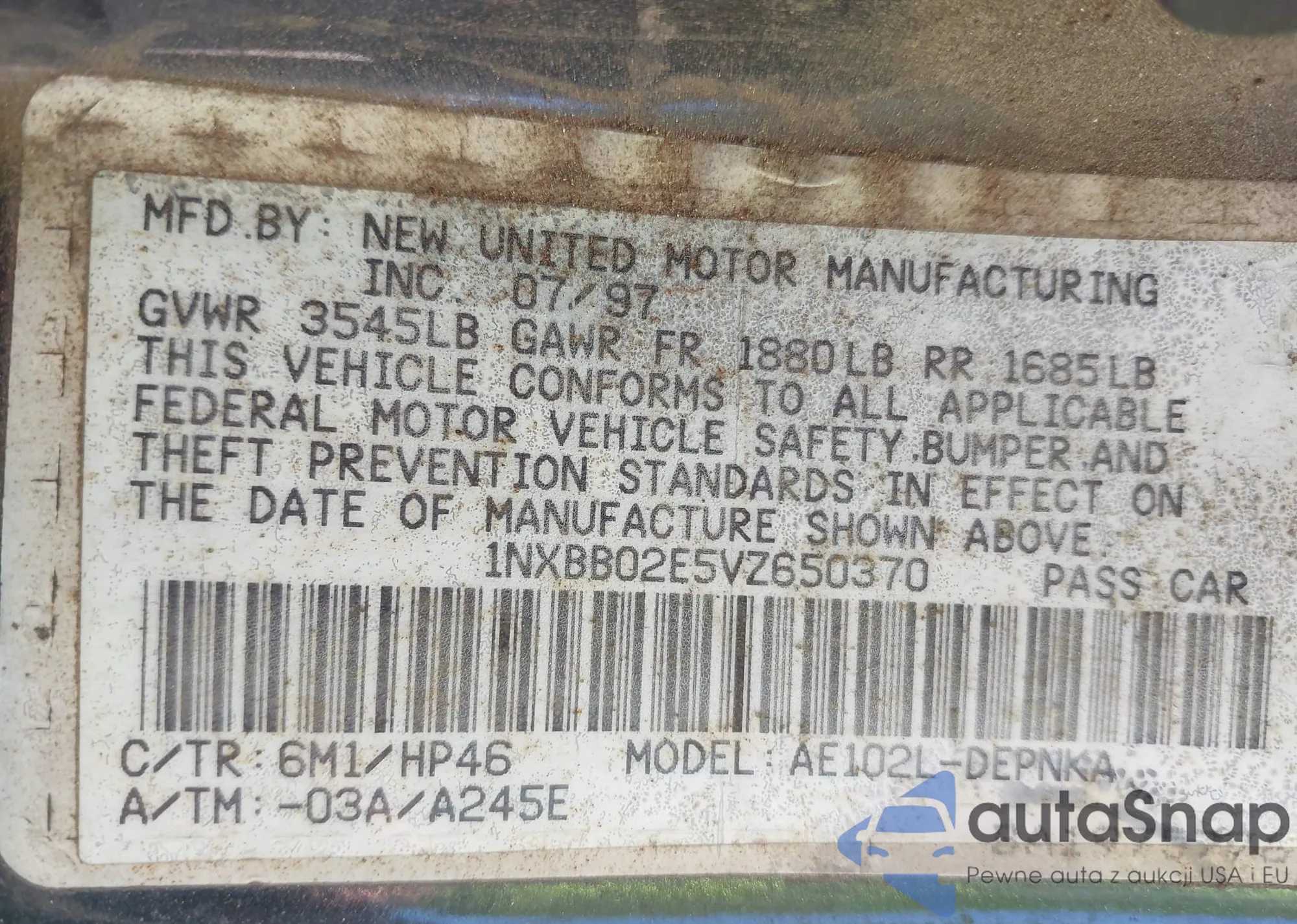 LOT: 43116508 VIN: 1NXBB02E5VZ650370