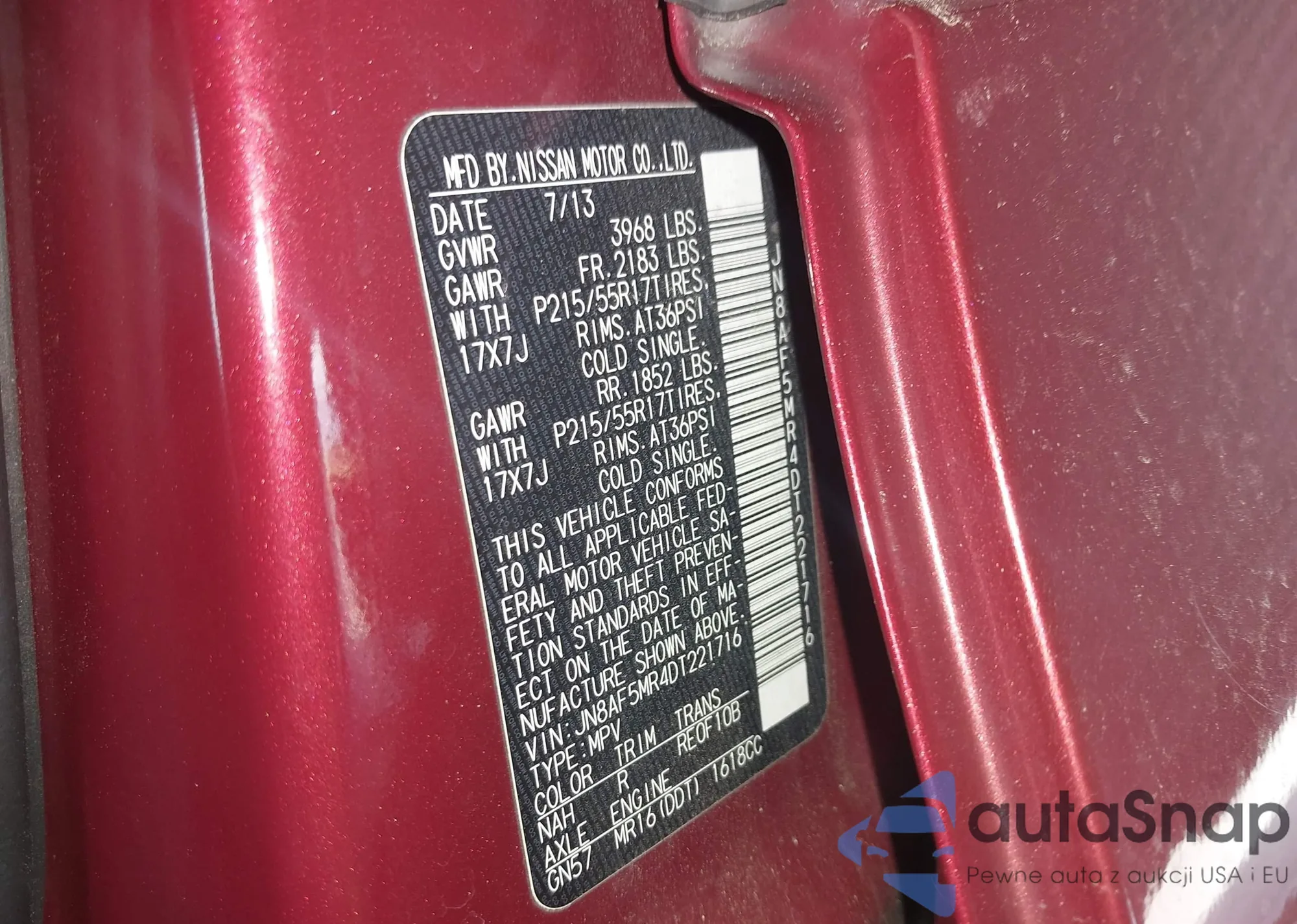 LOT: 42887669 VIN: JN8AF5MR4DT221716