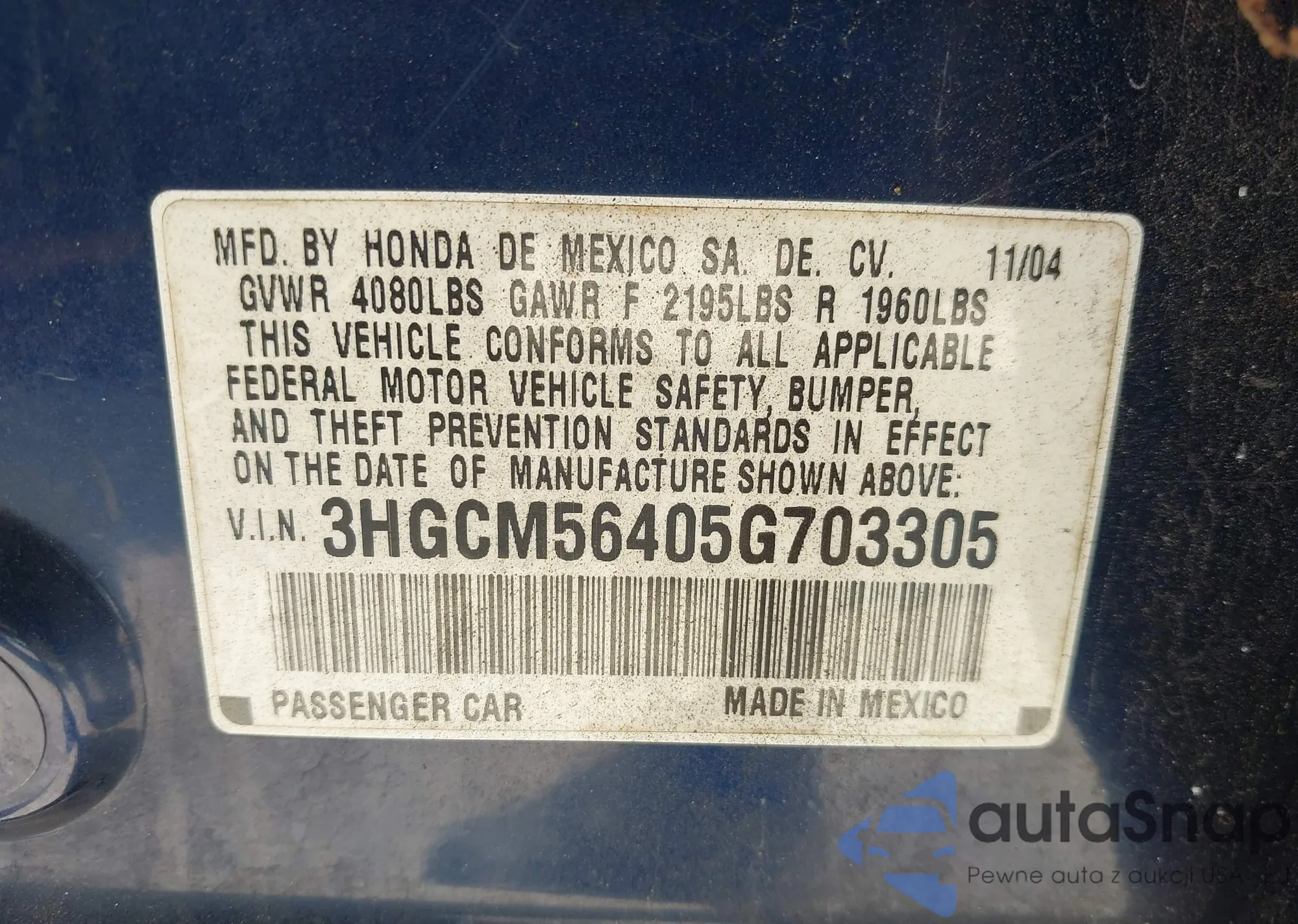 LOT: 40252935 VIN: 3HGCM56405G703305