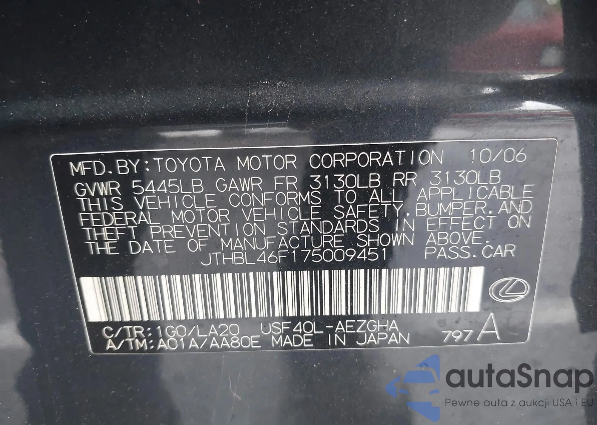 LOT: 42259147 VIN: JTHBL46F175009451