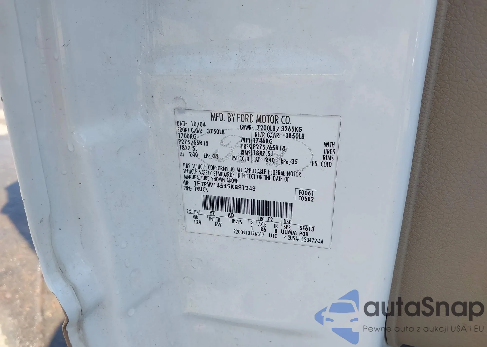 LOT: 42710624 VIN: 1FTPW14545KB81348