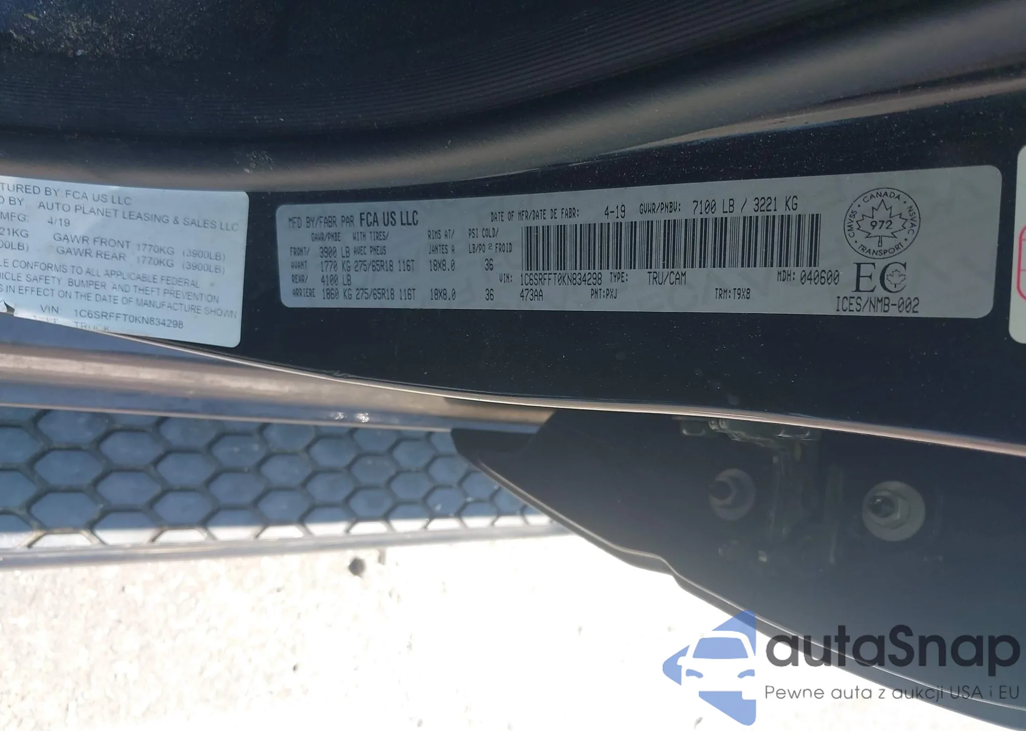 LOT: 42815678 VIN: 1C6SRFFT0KN834298