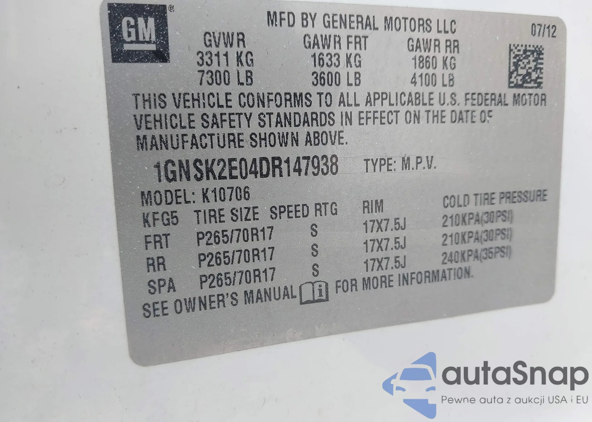 LOT: 43117585 VIN: 1GNSK2E04DR147938