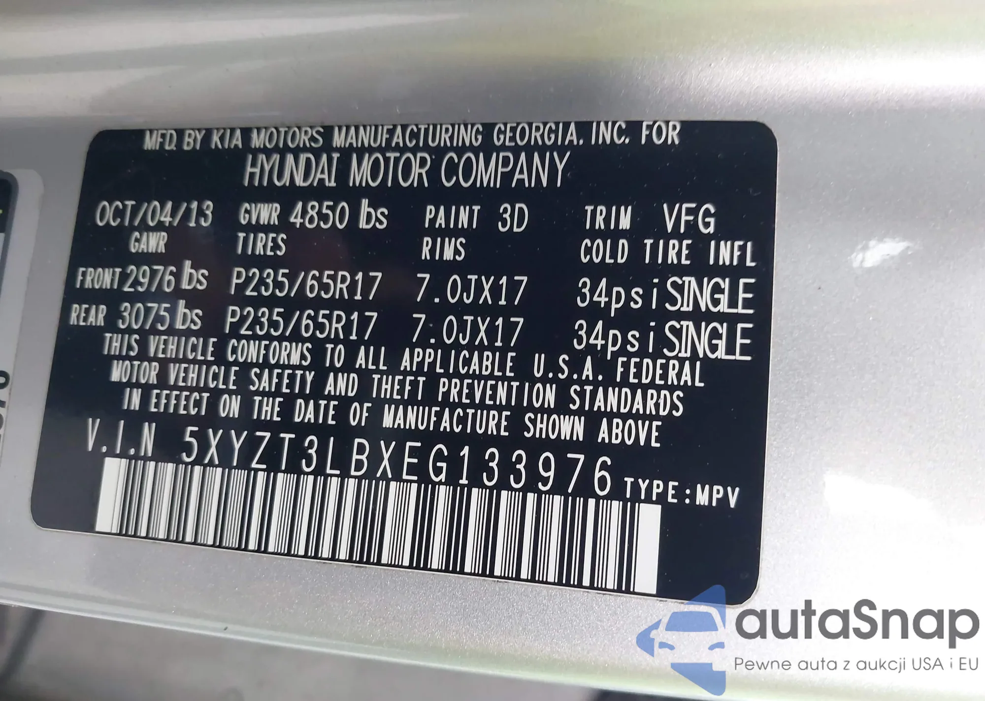 • VIN 5XYZT3LBXEG133976