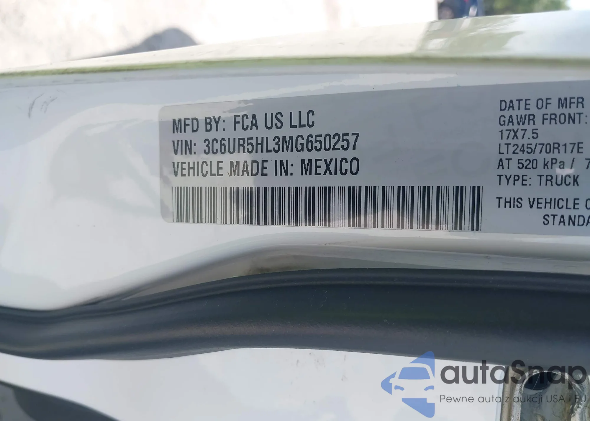 • VIN 3C6UR5HL3MG650257
