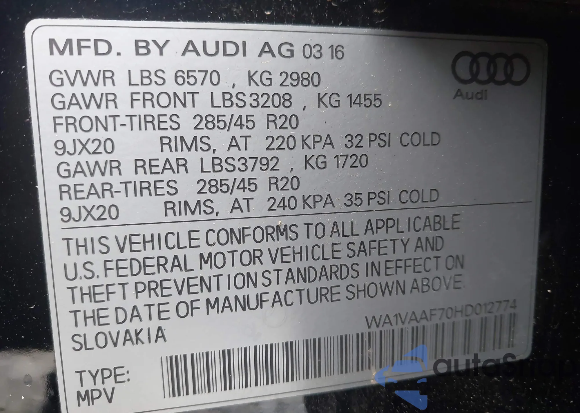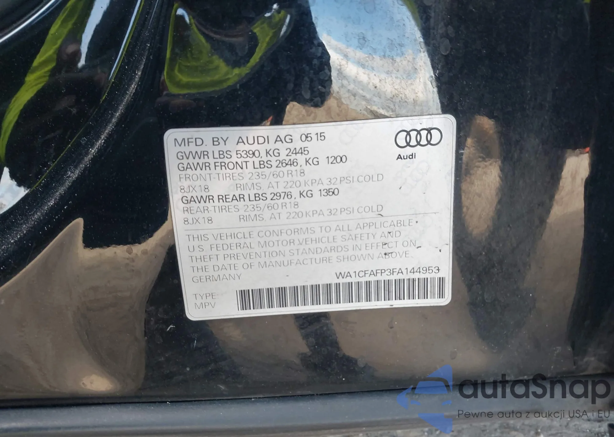 LOT: 42262550 VIN: WA1CFAFP3FA144953