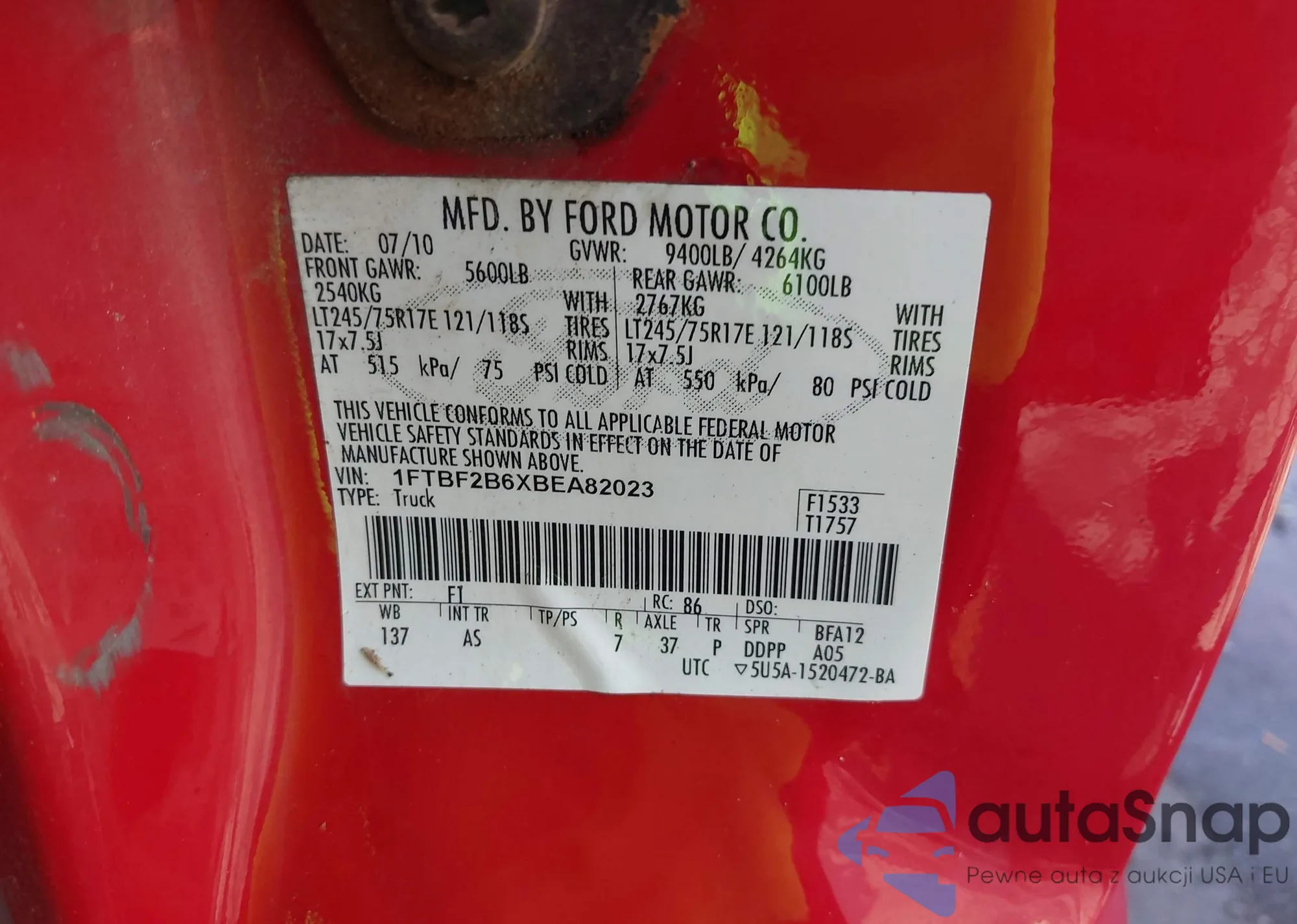 LOT: 42958036 VIN: 1FTBF2B6XBEA82023