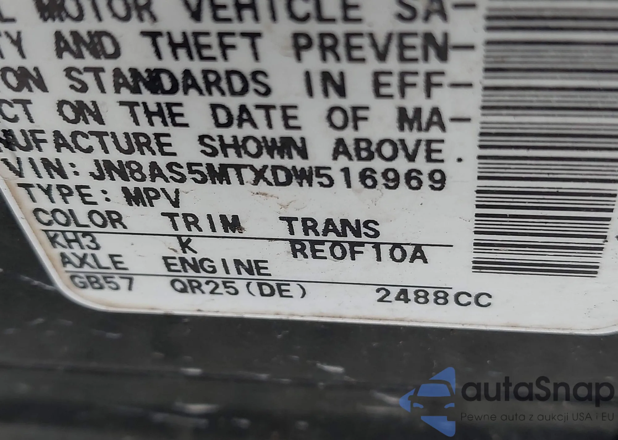 • VIN JN8AS5MTXDW516969