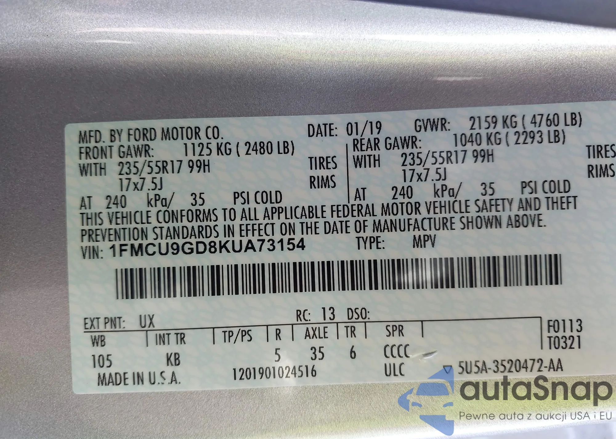 LOT: 42987069 VIN: 1FMCU9GD8KUA73154