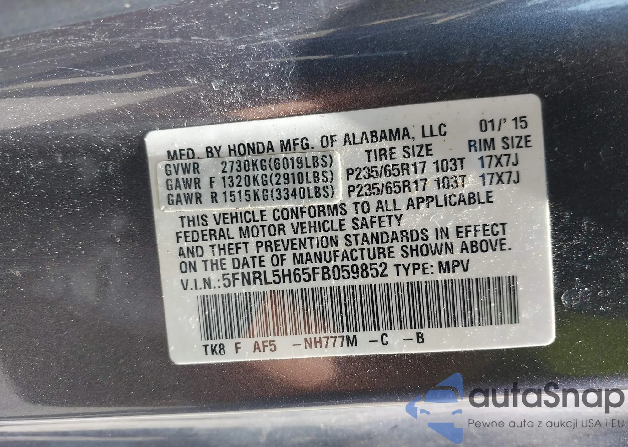 • VIN 5FNRL5H65FB059852