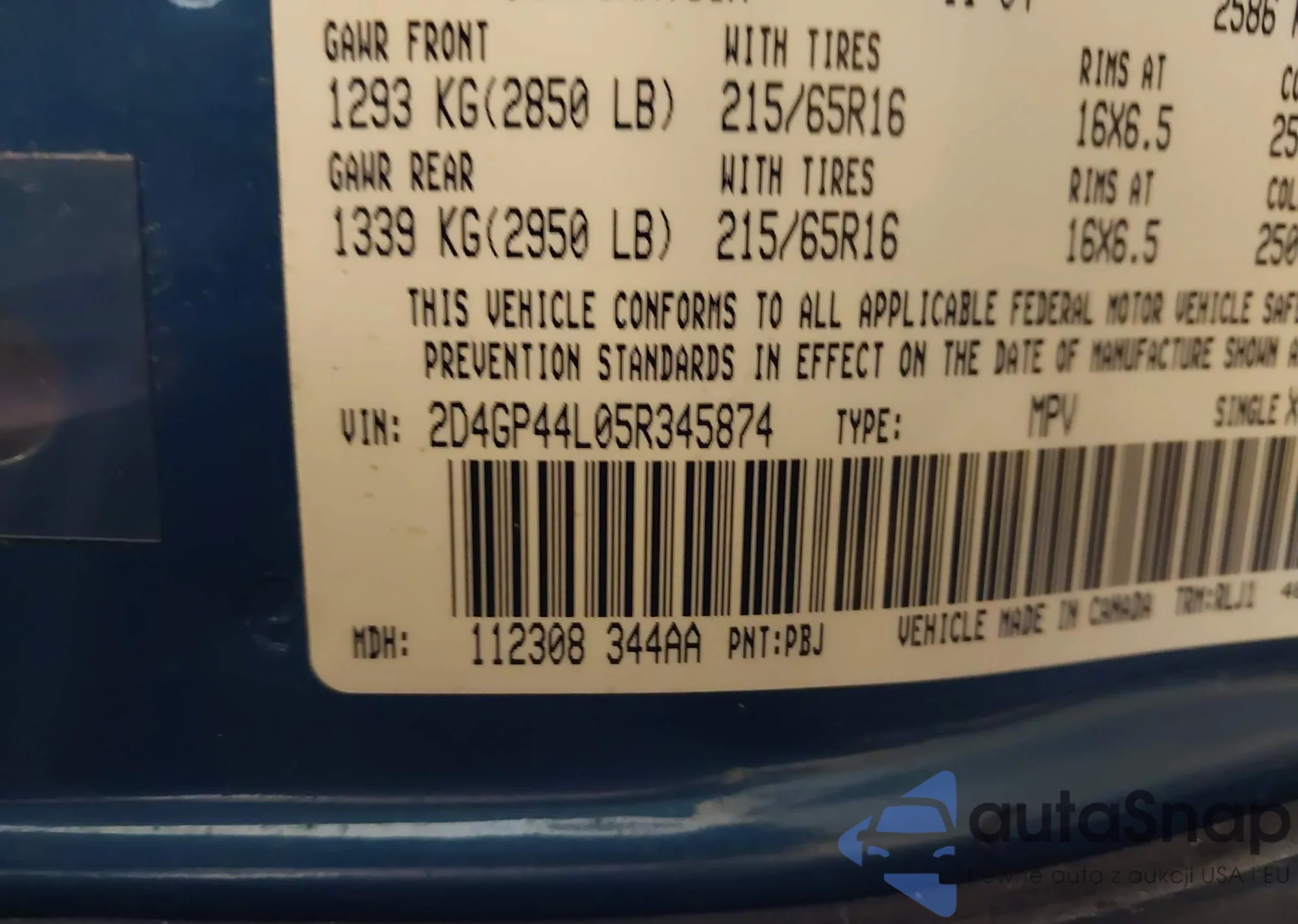 • VIN 2D4GP44L05R345874
