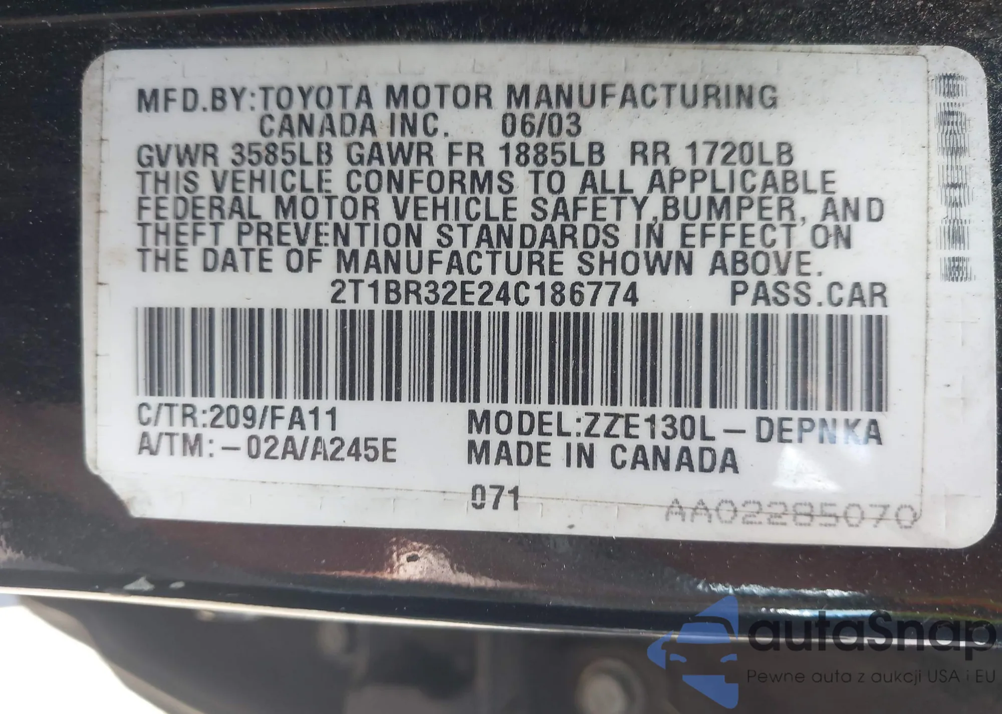• VIN 2T1BU4EE9BC703582